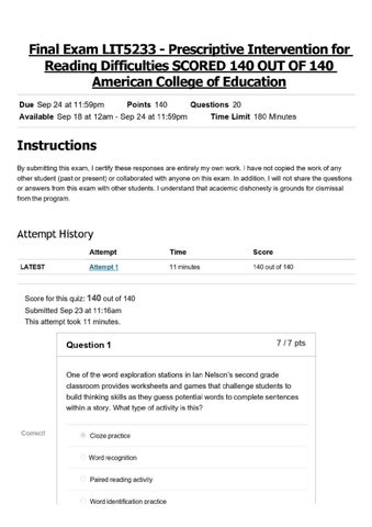 Final Exam LIT5233 - Prescriptive Intervention for Reading Difficulties SCORED 140 OUT OF 140 Americ