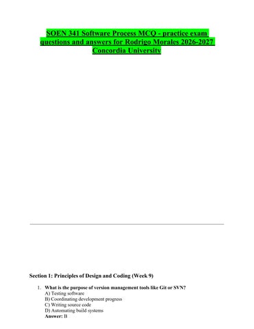 Section 1: Principles of Design and Coding (Week 9) 1. What is the purpose of version management tools like Git or SVN? A) Testing software B) Coordinating development progress C) Writing source code D) Automating build systems Answer: B