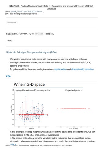In this example, we drop magnesium and we project the points onto a horizontal line, we can instead project it into other lines, planes, hyperplanes -> We project onto a line where the variability is the highest so that we don't lose out on information when we move to lower dimensions, and retain the most information as possible. Ide a This s t u d y s o u r c e was downloaded by 100000900134793 from CourseHero.com on 01-10-2026 12:10:17 GMT -06:00