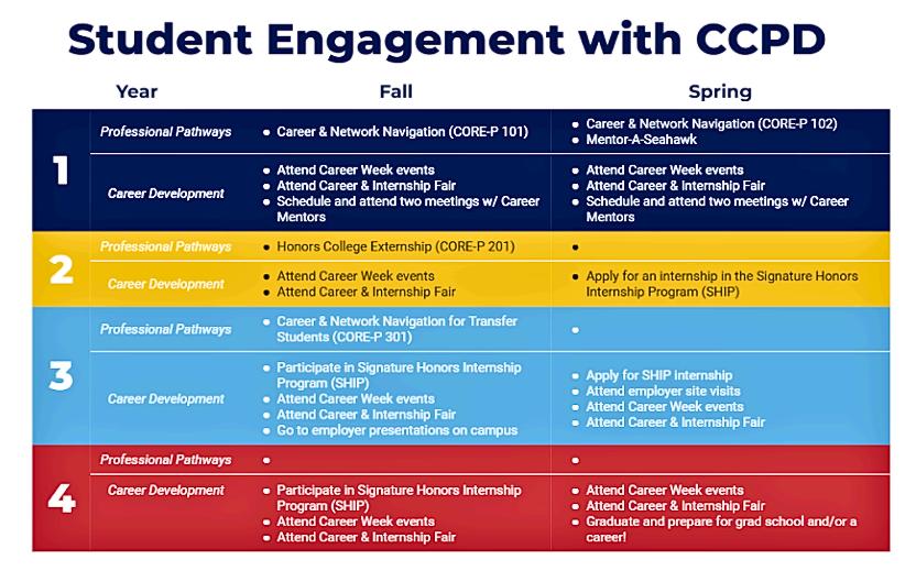 The student engagement chart below highlights how students engage with CCPD throughout their four years, followed by a closer look at each of our signature programs
