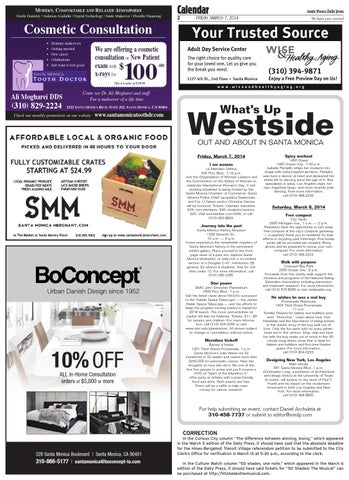Saturday, March 8, 2014 Free compost City Yards 2500 Michigan Ave., 7 a.m. — 2 p.m. Residents have the opportunity to cart away free compost at the city’s compost giveaway — a quarterly thank you to residents for their efforts in recycling yard trimmings. Five burlap sacks will be provided per resident. Bring gloves and be prepared to scoop your own compost. For more information, call (310) 458-2223. Walk with purpose Crescent Bay Park 2000 Ocean Ave., 9 a.m. Proceeds from this charity walk support the missions and programs of the National Eating Disorders Association including prevention and treatment research. For more information, call (212) 575-6200 or visit nedawalks.org. He wishes he was a real boy Promenade Playhouse 1404 Third Street Promenade 11 a.m. Twinkle Theatre for babies and toddlers presents “Pinocchio.” Learn about love, true friendship and the importance of being honest in this classic story of the boy built out of love. Only the fun parts with no scary adventures are in this version. Sing, clap and have fun with the boy made out of wood in this 30minute song-driven show that is ideal for babies and toddlers and first-time theatre goers. For more information, call (310) 804-0223. Designing New York, Los Angeles Main Library 601 Santa Monica Blvd., 1 p.m. Christopher Long, a professor of architectural and design history at the University of Texas at Austin, will lecture on the work of Paul T. Frankl and his impact on the modernism movement in both Los Angeles and New York. For more information, call (310) 458-8600.