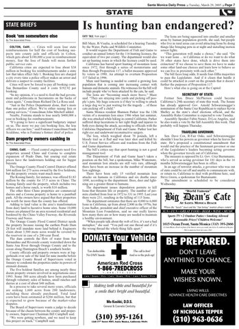 Bill Maze, R-Visalia, is scheduled for a hearing Tuesday by the Water, Parks and Wildlife Committee. It would require the Department of Fish and Game to conduct an annual lottery for the 116 hunting licenses, the equivalent of two per county. The department would also set up hunting zones in which the licenses could be used. California has barred sport hunting of mountain lions since 1972, first through a series of moratoriums and then through Proposition 117, a ballot measure approved by voters in 1990. An attempt to overturn Proposition 117 failed in 1996. Maze said hunting is needed to control a growing lion population that is coming into increasing contact with humans and domestic animals. His witnesses for the bill will include people who’ve been attacked by the cats, he said. The lions are “becoming much more brave,” Maze said. “They are straying into yards and picking off people’s pets. My huge concern is if they’re willing to attack a large dog we’re just waiting for the tragedy ... of these cats picking off a child.” Santa Monica resident Shannon Parker was the 12th victim of a mountain lion since 1986 when last summer, she was attacked while hiking in central California. Parker suffered deep lacerations to her right thigh and injuries to both eyes during the attack, according to officials with the California Department of Fish and Game. Parker lost her right eye and underwent reconstructive surgery. The lion, which weighed about 70 pounds, left a bloody trail as it fled and was later shot and killed by U.S. Forest Service officers and wardens from the Fish and Game department. The bill’s critics say that sport hunting is not a good management tool. The Department of Fish and Game hasn’t taken a position on the bill, but a spokesman, Mike Wintemute, said mountain lion attacks are still very rare, although there have been an increase in the number of mountain lion sightings. There have been only 15 verified mountain lion attacks on humans in California and six deaths since 1890, according to the department. Bees, deer and lightning are a greater threat to humans. The department issues depredation permits to kill lions that threaten life or property. The number of permits climbed from four in 1972 to 331 in 1995. Last year there were 231, resulting in the killing of 115 lions. The department estimates that there are 4,000 to 6,000 lions in California, up from about 2,000 in the 1970s, but Lynn Sadler, president and chief executive officer of the Mountain Lion Foundation, said no one really knows how many there are or how many are needed to maintain a healthy environment. “When people talk about the web of live, it’s not a bad metaphor,” she said. “You pull out one thread and if it’s the wrong thread the whole thing falls apart.”