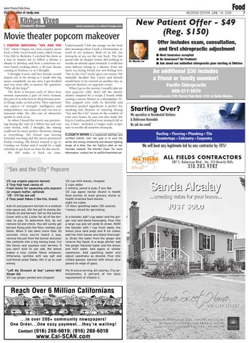 Unfortunately I left my energy on the boat that morning when I took a Dramamine to ward of sea sickness. Both of us left our stomachs at sea on the way back. The fast paced ride in choppy waters did nothing to soothe an already upset stomach. I could not even fathom sitting in a theater. Even my more sea faring friend was not feeling very “Sex in the City” ready upon out return. We mutually decided that Carrie and friends would have to be viewed on another day, in separate theaters, on opposite coasts. When I go to the movies I usually take my own popcorn (shh, don’t tell the theater chains) inspired by a recipe I found while visiting a movie theater in a Montpelier, Vt. This popped corn with its flavorful and nutrition packed ingredients is perfect for sneaking into theaters or enjoying during “Sex and the City” reruns in the comfort of your own home. In case you also make the trip to Catalina and find your stomach left at sea, I have included a Ginger soda recipe; sure to soothe all sensitive stomachs. ELIZABETH BROWN is a registered dietitian and certified holistic chef. Her goal is to save the world, one energy enhancing and disease fighting recipe at a time. See her Eat2Liv pilot on her YouTube channel: The Kitchen Vixen. For more information contact her at eat2liv@earthlink.net