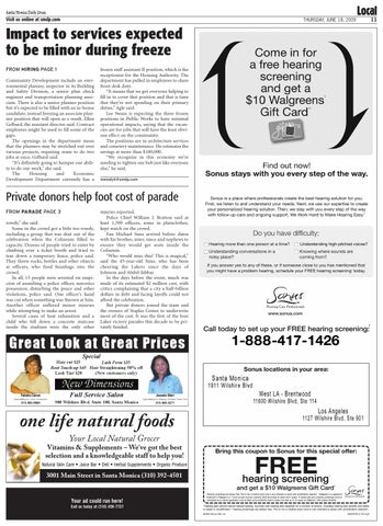 Impact to services expected to be minor during freeze FROM HIRING PAGE 1 Community Development include an environmental planner, inspector in its Building and Safety Division, a senior plan check engineer and transportation planning associate. There is also a senior planner position but it’s expected to be filled with an in-house candidate, instead freezing an associate planner position that will open as a result, Ellen Gelbard, the assistant director said. Contract employees might be used to fill some of the gaps. The openings in the department mean that the planners may be stretched out over various projects, requiring some to do two jobs at once, Gelbard said. “It’s definitely going to hamper our ability to do our work,” she said. The Housing and Economic Development Department currently has a