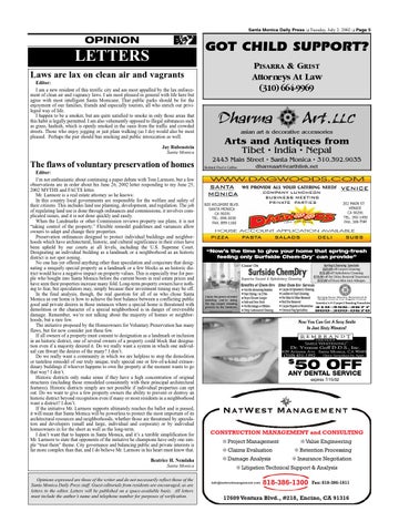 The flaws of voluntary preservation of homes Editor: I’m not enthusiastic about continuing a paper debate with Tom Larmore, but a few observations are in order about his June 26, 2002 letter responding to my June 25, 2002 MYTHS and FACTS letter. Mr. Larmore is a real estate attorney so he knows: In this country local governments are responsible for the welfare and safety of their citizens. This includes land use planning, development, and regulation. The job of regulating land use is done through ordinances and commissions, it involves complicated issues, and it is not done quickly and easily. When the Landmarks or other Commission reviews property use plans, it is not “taking control of the property.” Flexible remodel guidelines and variances allow owners to adapt and change their properties. Preservation ordinances designed to protect individual buildings and neighborhoods which have architectural, historic, and cultural significance in their cities have been upheld by our courts at all levels, including the U.S. Supreme Court. Designating an individual building as a landmark or a neighborhood as an historic district is not spot zoning. No one has yet offered anything other than speculation and conjecture that designating a uniquely special property as a landmark or a few blocks as an historic district would have a negative impact on property values. This is especially true for people who bought into Santa Monica before the current boom in real estate prices and have seen their properties increase many fold. Long-term property owners have nothing to fear, but speculators may, simply because their investment timing may be off. In the final analysis, though, the real question for all of us who chose Santa Monica as our home is how to achieve the best balance between a conflicting public good and private desires in those instances where a special home is threatened with demolition or the character of a special neighborhood is in danger of irreversible damage. Remember, we’re not talking about the majority of homes or neighborhoods, but a rare few. The initiative proposed by the Homeowners for Voluntary Preservation has many flaws, but for now consider just these few. If all owners of a property must consent to designation as a landmark or inclusion in an historic district, one of several owners of a property could block that designation even if a majority desired it. Do we really want a system in which one individual can thwart the desires of the many? I don’t. Do we really want a community in which we are helpless to stop the demolition or tasteless remodel of our truly unique, truly special one or few-of-a-kind extraordinary buildings if whoever happens to own the property at the moment wants to go that way? I don’t. Historic districts only make sense if they have a high concentration of original structures (including those remodeled consistently with their principal architectural features). Historic districts simply are not possible if individual properties can opt out. Do we want to give a few property owners the ability to prevent or destroy an historic district beyond recognition even if many or most residents in a neighborhood want a district? I don’t. If the initiative Mr. Larmore supports ultimately reaches the ballot and is passed, it will mean that Santa Monica will be powerless to protect the most important of its architectural resources and neighborhoods, whether those are threatened by speculators and developers (small and large, individual and corporate) or by individual homeowners in for the short as well as the long-term. I don’t want that to happen in Santa Monica, and it’s a terrible simplification for Mr. Larmore to state that opponents of the initiative he champions have only one simple “trust them” theme. City governance and balancing public and private interests is far more complex than that, and I do believe Mr. Larmore in his heart must know that. Beatrice H. Nemlaha Santa Monica Opinions expressed are those of the writer and do not necessarily reflect those of the Santa Monica Daily Press staff. Guest editorials from residents are encouraged, as are letters to the editor. Letters will be published on a space-available basis. All letters must include the author’s name and telephone number for purposes of verification.