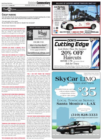 village’ thinking from City Hall. How can they and their egotistical view and taxpayer money save the world? Very little in Santa Monica is fair, unless you are part of the progressive voting block. Then mammon from City Hall heaven will fall upon you. Pretending Einsteins on the City Council favor selling hundreds of thousands of senior beach passes at cost — what? You say seniors won’t visit all at the same time. Huh? Why are we obviously supporting out-of-town elders? Senior beach passes should be just for Santa Monica seniors. Regular beach parking passes should be 50 percent less for Santa Monicans. How do you pay for this? Increase the fees just like everything else in this town, but this time jack the weekenders who trash our city with traffic and trash. Let’s support our own instead of supporting an un-American philosophy of universal entitlement.” “I’M 65 AND I CAN NO LONGER AFFORD A