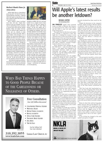 SM Bobby Sox Softball, AYSO soccer, and youth football. He was a longtime booster of Santa Monica and in his final years launched an online publication called “Santa Monica Boosters”. He had seven children and 14 grandchildren and was actively involved in their lives, attending every graduation, sports event and family celebration. He loved kids of many ages and his life as a parent was distinguished by involvement with his children’s many friends. He loved to treat everyone to his new favorite restaurant and relished the large family reunions. Give him the beach, the Dodgers, his dog Samohi and family… he was a happy man. He is survived by seven children, Anne Chase-Stapleton of Samish Island, WA, Ashley Andrews and husband Vincent of North Salem, NY, Herb Chase III of Pacific Palisades, Frances Workman and husband Henry Workman of Newbury Park, Carole Elliott and husband Glen of Palo Alto, step daughter Lory Bierschenk and husband Kurt of Pacific Palisades and Paige Chase of Santa Monica. He had 15 beloved and beautiful grandchildren: Chesley, Matt, Sarah, Hannah, Elizabeth, Michael, Katherine, Hank, Jack, Brinson, Mason, Alyssa, Jessica, Andrew and Bailey to which he was simply and lovingly known as “Granman”. 310-663-8652 for information on memorial gathering.