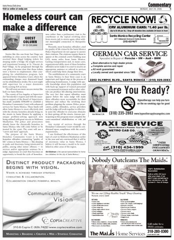 ness rather than a perfunctory visit to the courthouse or the typical revolving door from streets, jail, to streets again, often without meaningful connection to therapeutic services. Presently, most homeless offenders cited for quality of life crimes by the Santa Monica Police Department do not appear to answer their citations. The citations require them to appear at the criminal courts building near LAX, many miles from Santa Monica. Lacking transportation and, in many cases, organizational skills, most of these homeless offenders never make it to court to receive an appropriate sentence or referral to services which could help them change their lives. The establishment of a community court in Santa Monica to hear these cases is an important and logical step in the process of addressing homelessness. A judge with specific knowledge about this population and with back-up support of trained personnel to recommend treatment and/or other referrals can produce life-altering interventions. The very fact that repeat offenders must appear before the same judge will make these offenders more accountable for their behavior and reduce the revolving door problem plaguing the system. Police, prosecutors, public defenders, service providers and the judge will work together to effectively assist the offender to overcome obstacles to their getting off the streets. Anyone participating in this program must complete the court-mandated rehabilitation or risk jail time. Any receipt of services through the Homeless Community Court would be conditioned upon compliance with the court’s requirements. I saw firsthand the effectiveness of this type of court in Midtown Manhattan earlier in the year and am convinced that it will be of enormous value in Santa Monica. I believe it will become a model to be established in other areas of the region.