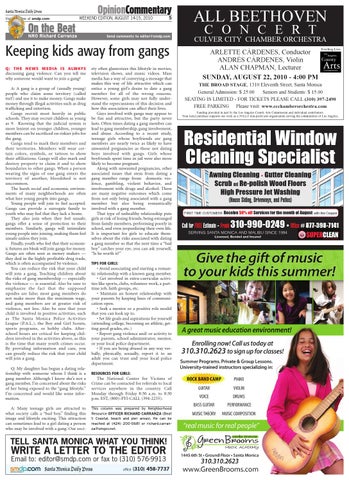 discussing gang violence. Can you tell me why someone would want to join a gang? A: A gang is a group of (usually young) people who claim some territory (called turf) and use it to make money. Gangs make money through illegal activities such as drug trafficking and extortion. Gangs recruit most heavily in public schools. They may recruit children as young as 9. Knowing that the judicial system is more lenient on younger children, younger members can be sacrificed on riskier jobs for the gang. Gangs tend to mark their members and their territories. Members will wear certain colors, symbols, or tattoos to show their affiliations. Gangs will also mark and destroy property to claim it and to show boundaries to other gangs. When a person wearing the signs of one gang enters the territory of another, bloodshed is not uncommon. The harsh social and economic environments of many neighborhoods are often what lure young people into gangs. Young people will join to feel accepted. Gangs can provide a surrogate family to youth who may feel that they lack a home. They also join when they feel unsafe; gangs offer a sense of protection to their members. Similarly, gangs will intimidate young people into joining, making them feel unsafe unless they join. Finally, youth who feel that their economic futures are bleak will join gangs for money. Gangs are often seen as money makers — they deal in the highly profitable drug trade, which is often accompanied by violence. You can reduce the risk that your child will join a gang. Teaching children about the risks of gang membership — especially the violence — is essential. Also be sure to emphasize the fact that the supposed upsides are false; most gang members do not make more than the minimum wage, and gang members are at greater risk of violence, not less. Also be sure that your child is involved in positive activities, such as The Santa Monica Police Activities League (P.A.L.), the Boy and Girl Scouts, sports programs, or hobby clubs. Afterschool hours are critical for keeping children involved in the activities above, as this is the time that many youth crimes occur. By providing information and care, you can greatly reduce the risk that your child will join a gang. Q: My daughter has begun a dating relationship with someone whom I think is a gang member. Although I know she’s not a gang member, I’m concerned about the risks of her being exposed to the “gang lifestyle.” I’m concerned and would like some information. A: Many teenage girls are attracted to what society calls a “bad boy,” finding this image and lifestyle exciting. This attraction can sometimes lead to a girl dating a person who may be involved with a gang. Our soci-