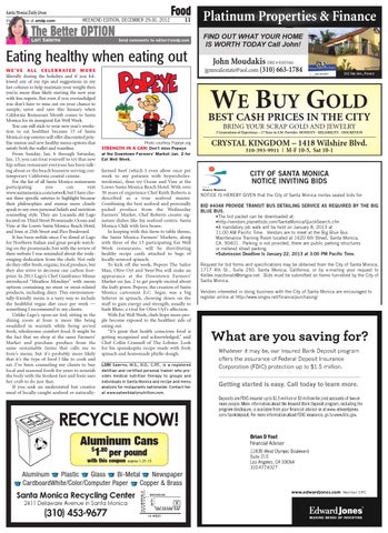 liberally during the holidays and if you followed any of my tips and suggestions in my last column to help maintain your weight then you’re more than likely starting the new year with less regrets. But even if you overindulged you don’t have to miss out on your chance to sample, savor and save this January when California Restaurant Month comes to Santa Monica for its inaugural Eat Well Week. You can still stick to your new year’s resolution to eat healthier because 13 of Santa Monica’s top eateries will offer discounted prixfixe menus and new healthy menu options that satisfy both the wallet and waistline. From Sunday, Jan. 6 through Saturday, Jan. 13, you can treat yourself to try that new hip urban restaurant everyone has been talking about or the beach brasserie serving contemporary California coastal cuisine. For the list of all Santa Monica restaurants participating you can visit www.santamonica.com/eatwell, but I have chosen three specific eateries to highlight because their philosophies and menus more closely speak to my own personal beliefs and nutrition counseling style. They are Locanda del Lago located on Third Street Promenade, Ocean and Vine at the Loews Santa Monica Beach Hotel, and Josie at 25th Street and Pico Boulevard. It has been awhile since I’ve dined at Lago for Northern Italian and great people watching on the promenade, but with the review of their website I was reminded about the wideranging dedication from the chefs. Not only do they offer fresh, organic, local produce, but they also strive to decrease our carbon footprint. In 2011 Lago’s Chef Gianfranco Minuz introduced “Meatless Mondays” with menu options containing no meat or meat-related products, including dairy. This environmentally-friendly menu is a tasty way to include the healthful vegan diet once per week — something I recommend to my clients. Unlike Lago’s open-air feel, sitting in the dining room at Josie is more like being swaddled in warmth while being served fresh, wholesome comfort food. It might be the fact that we shop at the same Farmers’ Market and purchase produce from the same sustainable farms that calls me to Josie’s menu, but it’s probably more likely that it’s the type of food I like to cook and eat. I’ve been counseling my clients to buy local and seasonal foods for years to nourish the body with the freshest fare and Josie uses her craft to do just that. If you seek an understated but creative meal of locally-caught seafood or naturally-