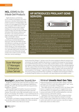 HP INTRODUCES PROLIANT GEN8 SERVERS HP unveiled two new HP ProLiant Generation 8 (Gen8) four-socket servers that facilitate customers’ move to cloud while delivering increased compute power in less space and a return on investment within three months. The industry’s first four-socket servers to incorporate HP ProActive Insight Architecture,the HP ProLiant BL660c and DL560 Gen8 servers significantly reduce the time spent on maintenance tasks through high levels of automation and continuous monitoring of system health, saving IT staff more than 30 days of administration time a year. As building blocks for HP Converged Infrastructure, these multiprocessor servers satisfy the need for high-end compute power that enables clients to extend end-to-end virtualization and provide a foundation for creating private and hybrid clouds. With a three-to-one server-consolidation rate and reduced server footprint in the data center, the HP ProLiant BL660c Gen8 server offers four-socket density in half the size of the previous generation, and reduces total cost of ownership (TCO) by up to 30 percent. Additionally, the HP ProLiant DL560 Gen8 server provides a space-minimizing four-socket server in a 2U form factor without compromising performance, scalability or expansion requirements.