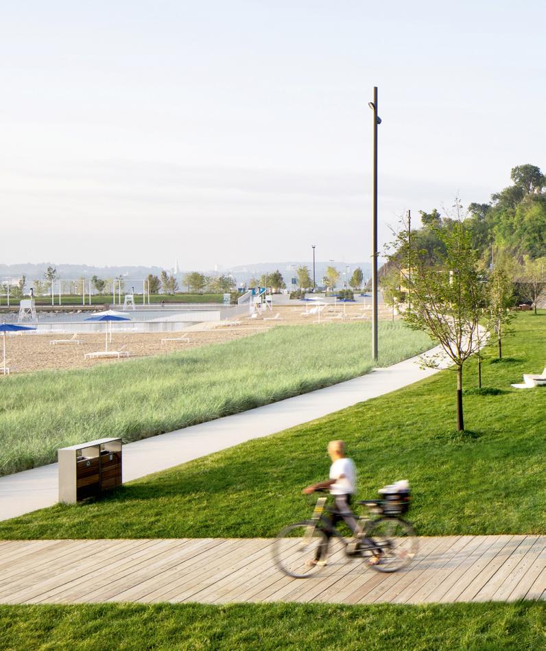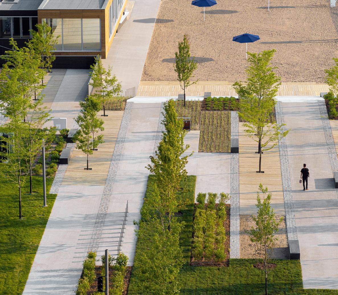 Kiekviena parko dalis yra vis kitos paskirties. Šiaurinė, esanti šalia gyvenamojo rajono, orientuota į sportą. Rytinėje, sujungtoje su metro, įrengtos lauko užkandinės ir alaus sodas. Maisto zona pereina į pietinę dalį – įvairių formų žaidimų aplinką. Ji susieta su šeimoms skirtos mažmeninės prekybos erdve, išplėtota per centrinę aikštę iki senovinį miestą primenančių sujungtų edukacinių vandens, gyvatvorės, žemės ir medžių labirintų vakarinėje dalyje. Pasak architektų,