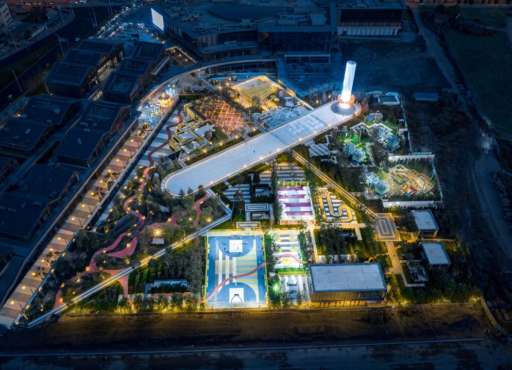 visas parkas suprojektuotas kaip itin aktyvi 24 valandas per parą veikianti erdvė, joje sukurtas kraštovaizdžio, mažmeninės prekybos, būsto ir metro balansas.