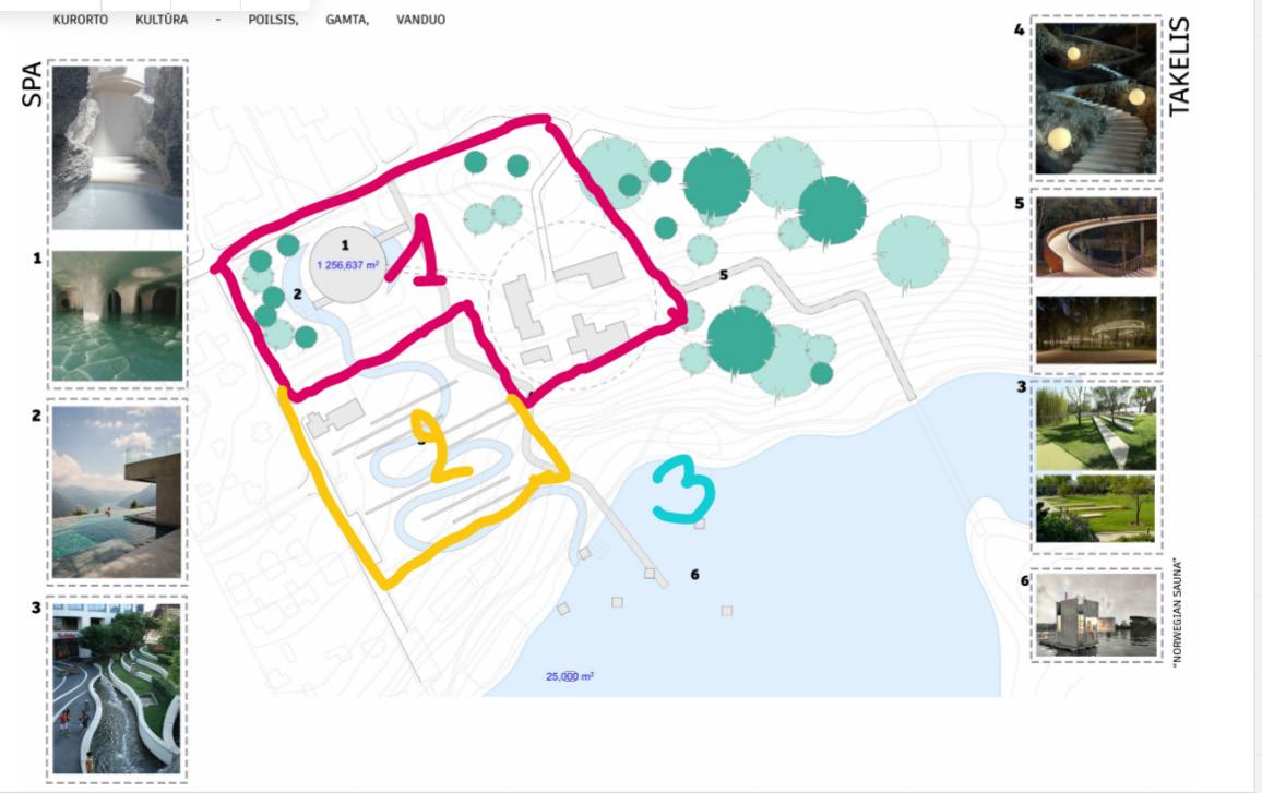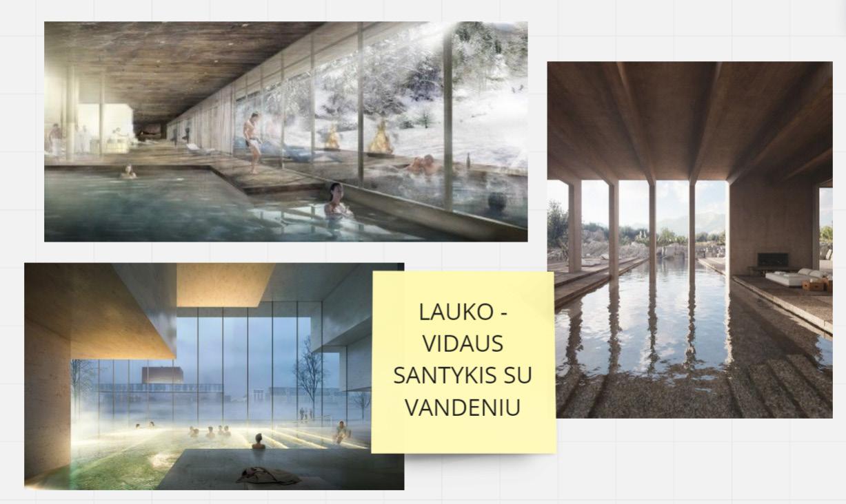 Abiejuose pastatuose yra vandens takas, vedantis aplink visą aikštelę. Jis teka aplink pastatus, vesdamas žmones gilyn ir aplink kiekvieną objektą. Vienas iš objektų, kuris, mūsų manymu, išskiria mus ir mūsų idėją – pirtys ant ežero. Visa mūsų koncepcija – būti apsuptam vandens, todėl išlikti vandens paviršiuje ir visiškoje harmonijoje su gamta tai tik paryškina.