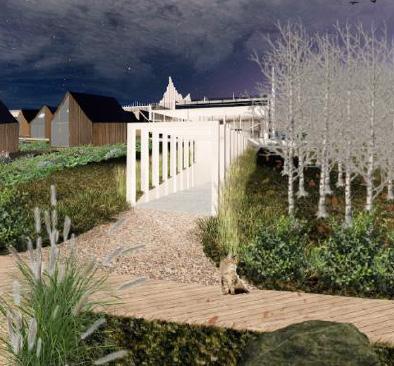 Both buildings have a water path, leading all around the site. It swirls and flows around the buildings, leading people deeper and around every object on site. One of the objects that we think differentiates us and our idea - saunas on the lake. Our whole concept is to be surrounded by water, therefore to stay afloat and in total harmony with nature only accentuates it.