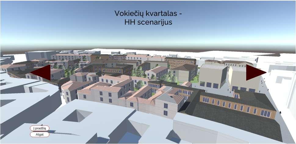 Tyrimo metu surinkti duomenys ir pasiūlyti sprendimai buvo vizualizuoti virtualios realybės aplikacijos Unity aplinkoje. Aplikaciją sudaro esamos situacijos žemėlapis su pasirenkamais skirtingos būklės kvartalais. Pagal atitinkamus kriterijus vartotojas gali modeliuoti skirtingus kvartalų scenarijus bei stebėti kaip atlikti sprendimai keičia autentiškumo ir efektyvumo rodiklius.
