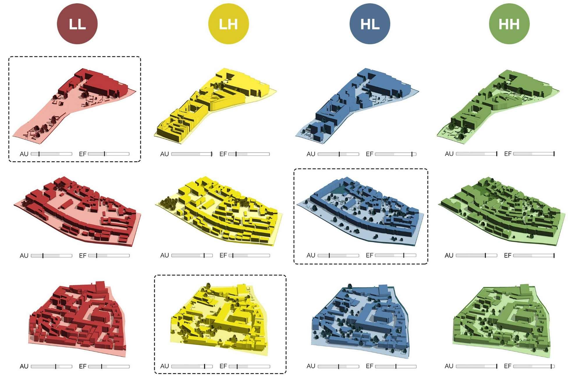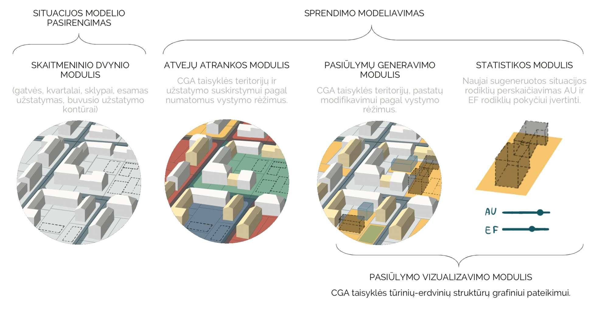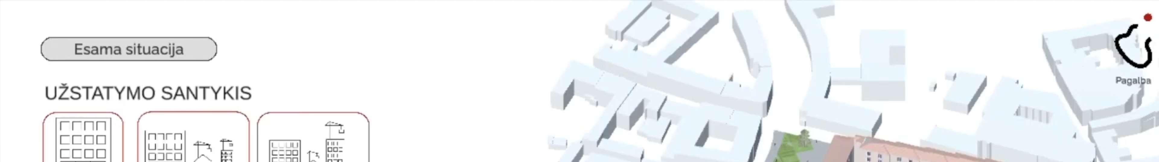 3) Keičiant parametrus, tokius kaip užstatymo, dangų ir darbo/gyventojų santykį, sugeneruojamos naujos kvartalo situacijos, leidžiančios vizualiai pažinti skirtingus galimus teritorijos vystymo scenarijus.
