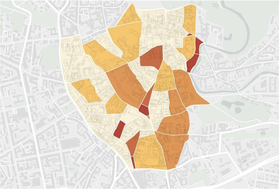 Palyginamas 2023 m. ir 1911 m. užstatymo tankis. Didesnės vertės reiškia labiausiai pakitusį kvartalo antžeminės dalies užstatymo plotą, ten kur yra daugiausiai sunykusių istorinių pastatų arba tankiausiai pristatytų naujų.