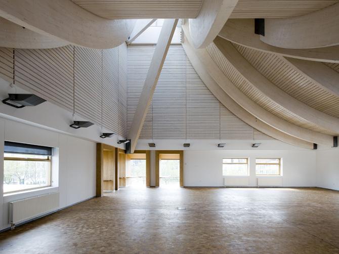 Roof has a complex irregular shape, so space frame construction is planned to use I have cjosen space fram from laminated timber with metal elements(due to irregular roof shape, and impossibility to create modular space frame elements). For building D would be used metal space frame due to larger span - such span is needed for a climbing pavilion.