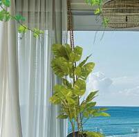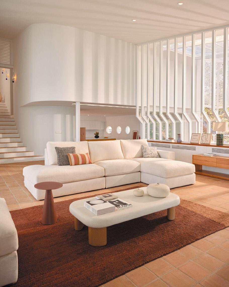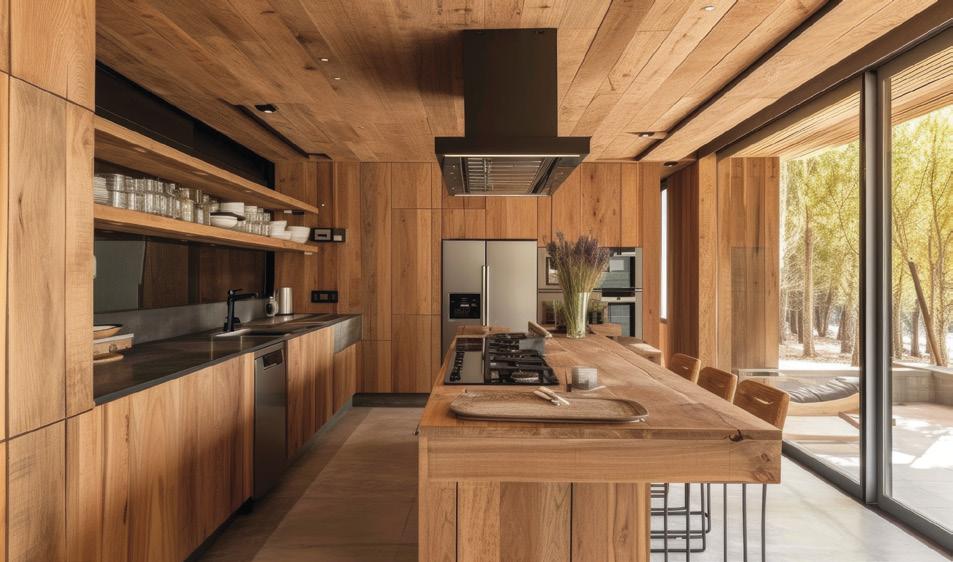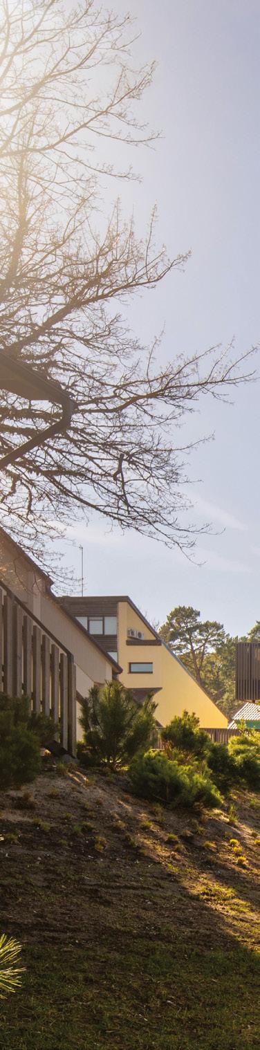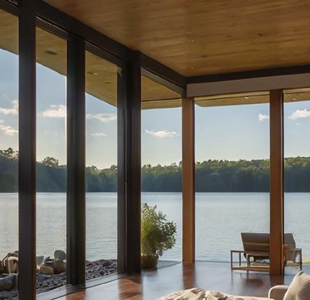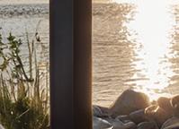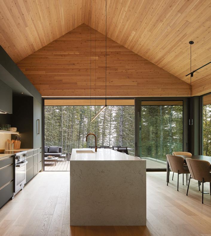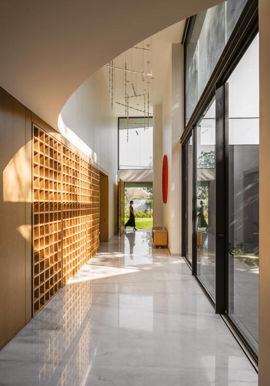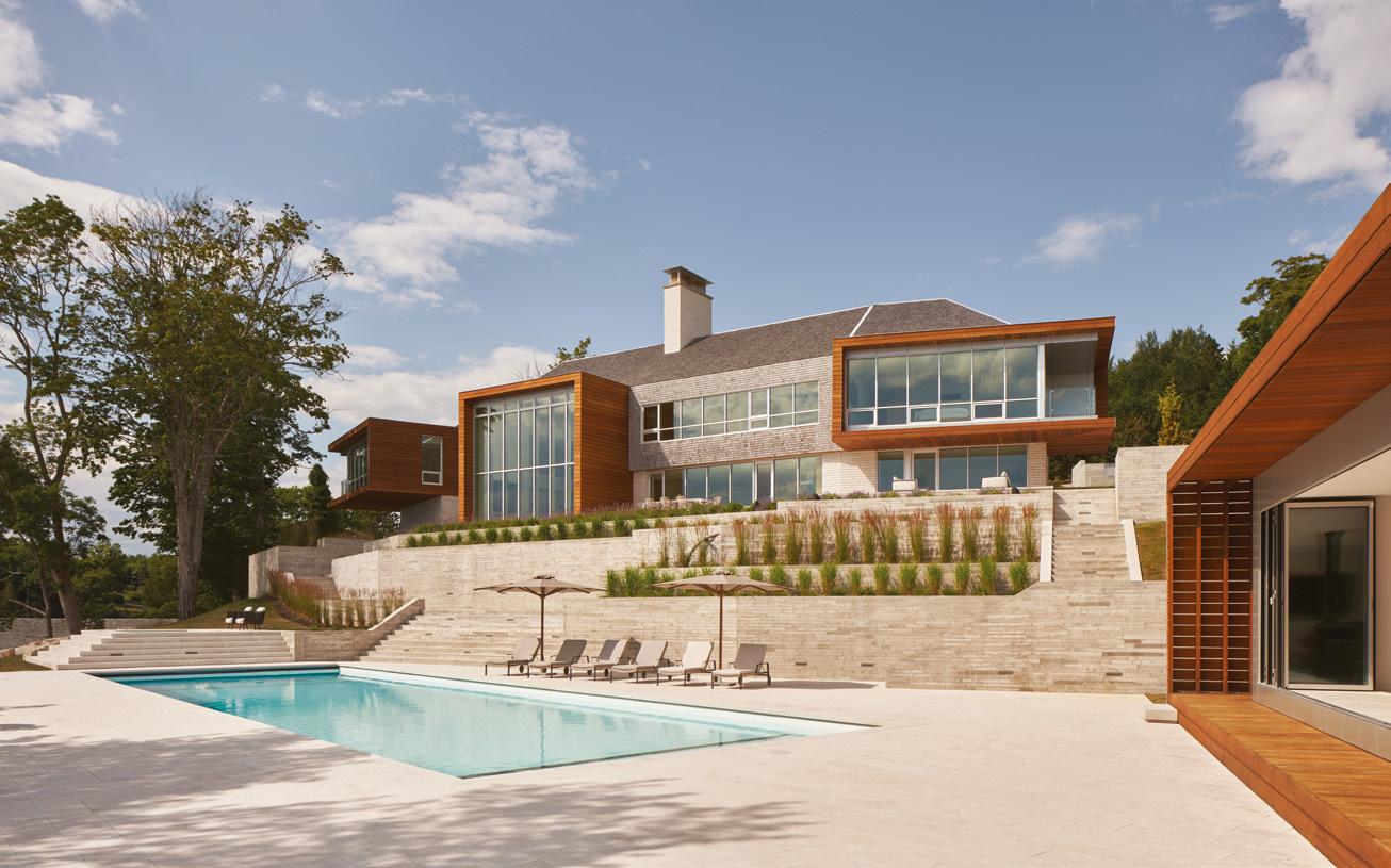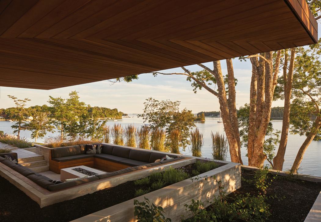 kytas įvairiems sezonams. Didžiulės stiklo plokštumos kuria pojūtį, kad interjeras sklando vandenyno fone. Pakrantėje esantis valties namelis ir prieplauka – erdvė poilsiui ir buriavimui. Aukštesnė sklypo terasa sujungia pagrindinį gyvenamojo namo plotą: valgomąjį, svetainę ir lauko židinio zoną su grilio vieta. Visa tai subtiliai įkomponuota po stogo atbraila, kuri veikia kaip architektūrinė pavėsinė. Iš gatvės pusės pastatas išlaiko kuklų mastelį, tačiau atsivėręs į privačią pakrantę virsta ekspresyvia erdve, kurioje dominuoja stiklo sienos. Vienas iš svarbiausių interjero akcentų – spiraliniai laiptai, pagaminti iš masyvaus medžio naudojant pažangias penkių ašių CNC technologijas. Jie ne tik funkciškai jungia erdves, bet ir tampa skulptūriniu elementu. Pastato pamatai yra iš tvirto kalkakmenio, o fasadai ir stogas dengti baltojo ir raudonojo kedrų medienos lentomis, kurios laikui bėgant įgis pilkšvai sidabrinį atspalvį. Interjero paletėje dominuojantys balintas ąžuolas ir šviesus kalkakmenis sukuria ramų, sodrų foną aplinkos vaizdams ir savininkų meno kolekcijai.