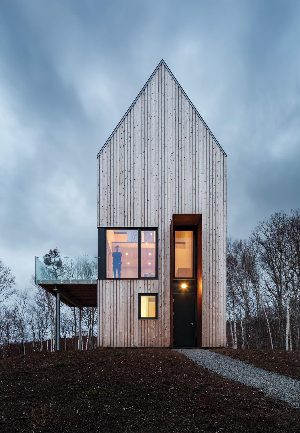 „Rabbit Snare Gorge“ nutūpęs miške prie dramatiško Keip Bretono (Cape Breton) salos pakrantės šlaito. Šiame 18,6 ha sklype kadaise savininko prosenelis mokė savo sūnus gaudyti kiškius kilpomis, o prosenelė skalbdavo drabužius po putojančia krioklio srove. Gamta iki šiol čia laukinė, beveik nepaliesta, nes dėl itin stačių tarpeklių bei sudėtingo reljefo nebuvo įmanoma jokia intensyvi veikla. Tai ir tapo projekto idėjos pagrindu. Namelis – tarsi gyvenamoji skulptūra, kaip dvišlaitis bokštas kyla virš medžių lajos. Du strateginiai langų pjūviai atveria kraštovaizdį į dvi puses: į vandenyną ir į upelio slėnį. Erdvės organizuotos vertikaliai: pirmajame aukšte įrengti miegamieji, antrajame – virtuvė ir valgomasis, o viršutiniame – svetainė su apžvalgos platforma, iš kurios atsiveria kvapą gniaužianti salos panorama. Klasikinė dvišlaitė stogo geometrija subtiliai deformuota, kad sektų saulės trajektoriją ir sukurtų vertikalią kompoziciją, leidžiančią efektyviai nutekėti lietui bei tirpstan-