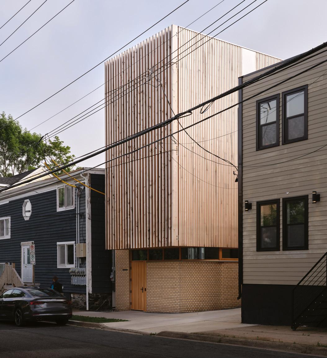šviesos pasiskirstymą visoje erdvėje. Trečiasis aukštas skirtas poilsiui – jame įrengti du miegamieji, iš jų vienas, architekto sūnaus, atvira anga sujungtas su gyvenamąja erdve. Dviejų aukštų lauko fasadai, apkalti rytinės Kanados kedrinės pušies dailylentėmis, kyla virš plytų podiumo, kurio tonai atkartoja vietinės Halifakso architektūros tradicijas. Virtuvėje ir pagrindiniame miegamajame iki pat grindų tęsiasi stiklinės sienos, už jų – vakarinės Kanados raudonmedžio širma, užtikrinanti privatumą dieną ir šiltą švytėjimą vakare. Nuo rankų darbo bronzinių turėklų laikiklių iki subtilių, plytų faktūroje pasislepiančių apšvietimo elementų – viskas čia liudija architekto meistriškumą. Laikas jau paliko savo pėdsaką – kedro apdaila natūraliai išbluko, tačiau namas išlaiko savo unikalų, smalsumą žadinantį charakterį.