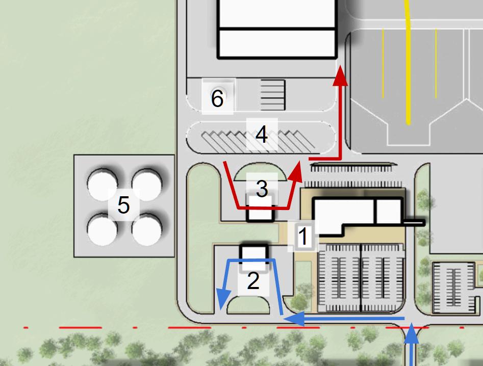 Fuel zone - for fuel delivery, refueling of vehicles, parking, and administration.