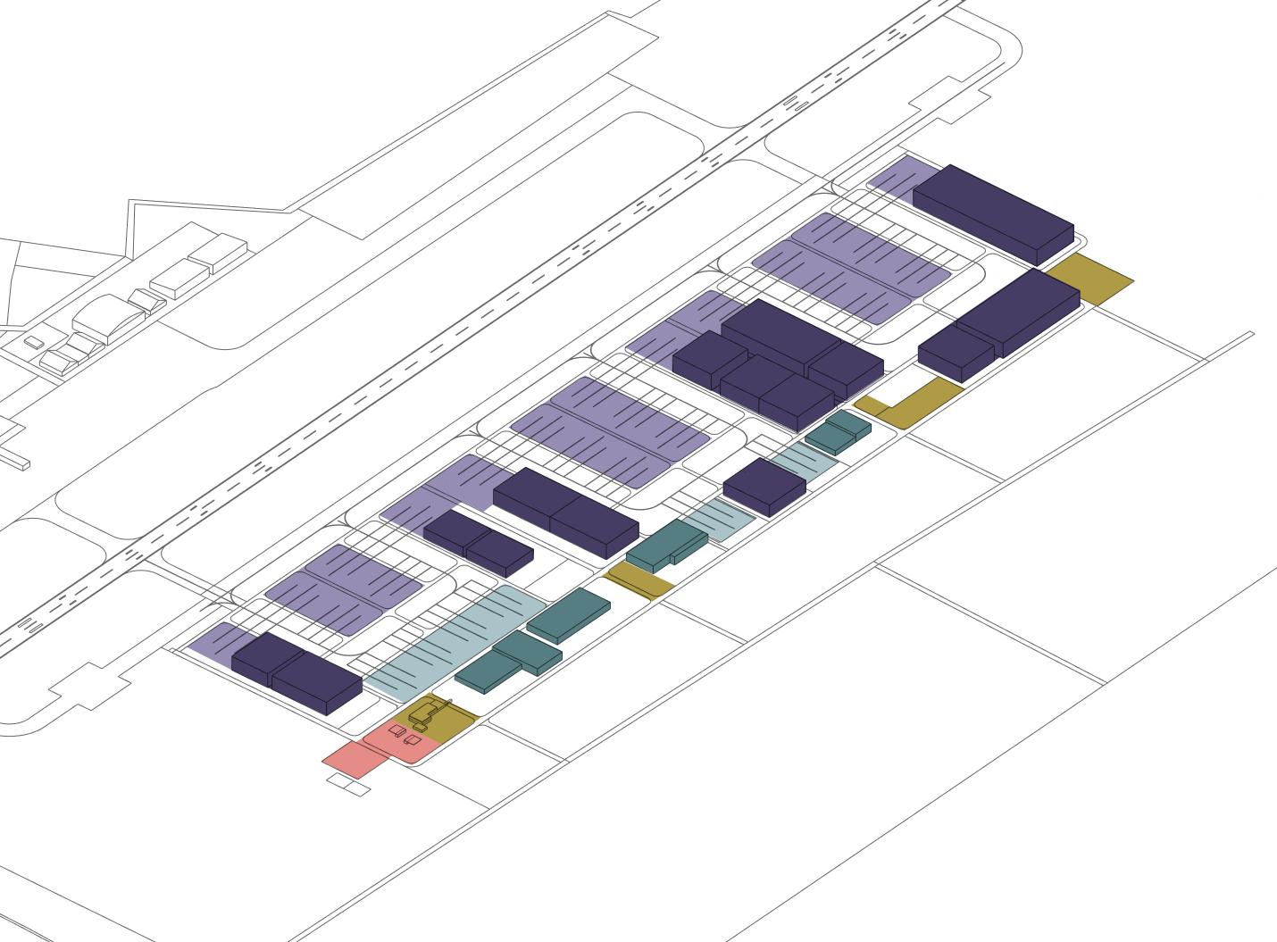 Storage/logistics zones are located in the southern part of the territory so that arriving trucks do not need to enter the secured airport area. This layout is also conducive to further development of logistics companies within the FEZ zone.