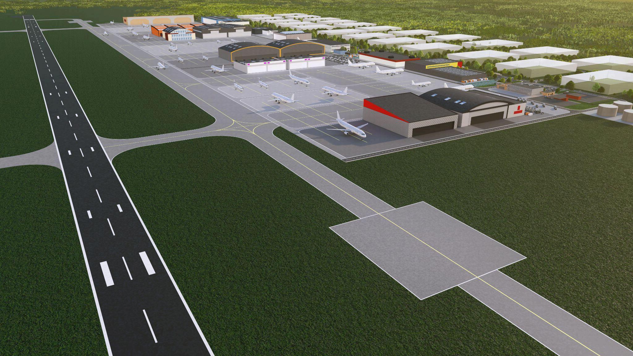 Hangar locations are planned so that aircraft can easily enter them from the apron. Aprons are laid out in the middle of the MRO and cargo zones for easy access to both hangars and storage buildings.
