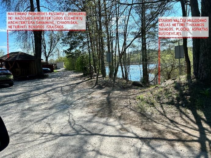 The northern territory is dedicated to episodic recreation - both for tourists passing through tourist routes (moving along the national automobile route "Nemunas road", bicycle routes) and for citizens. A roadside cafe, a small beach with the necessary infrastructure, and a boat dock (connecting two shores of the lake) are being designed.