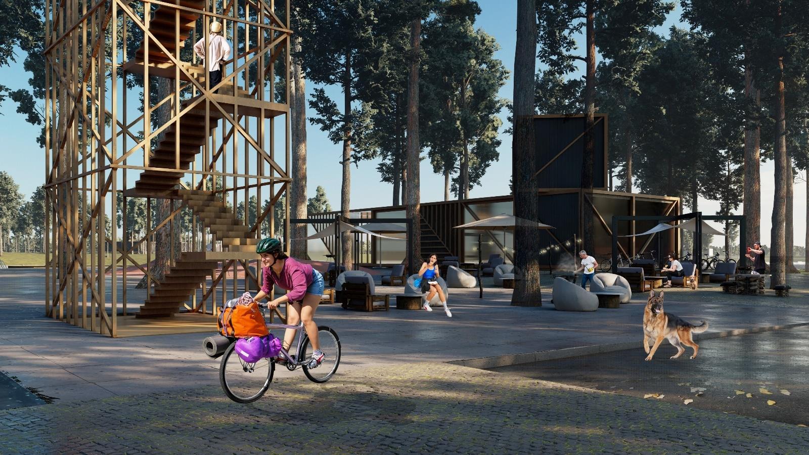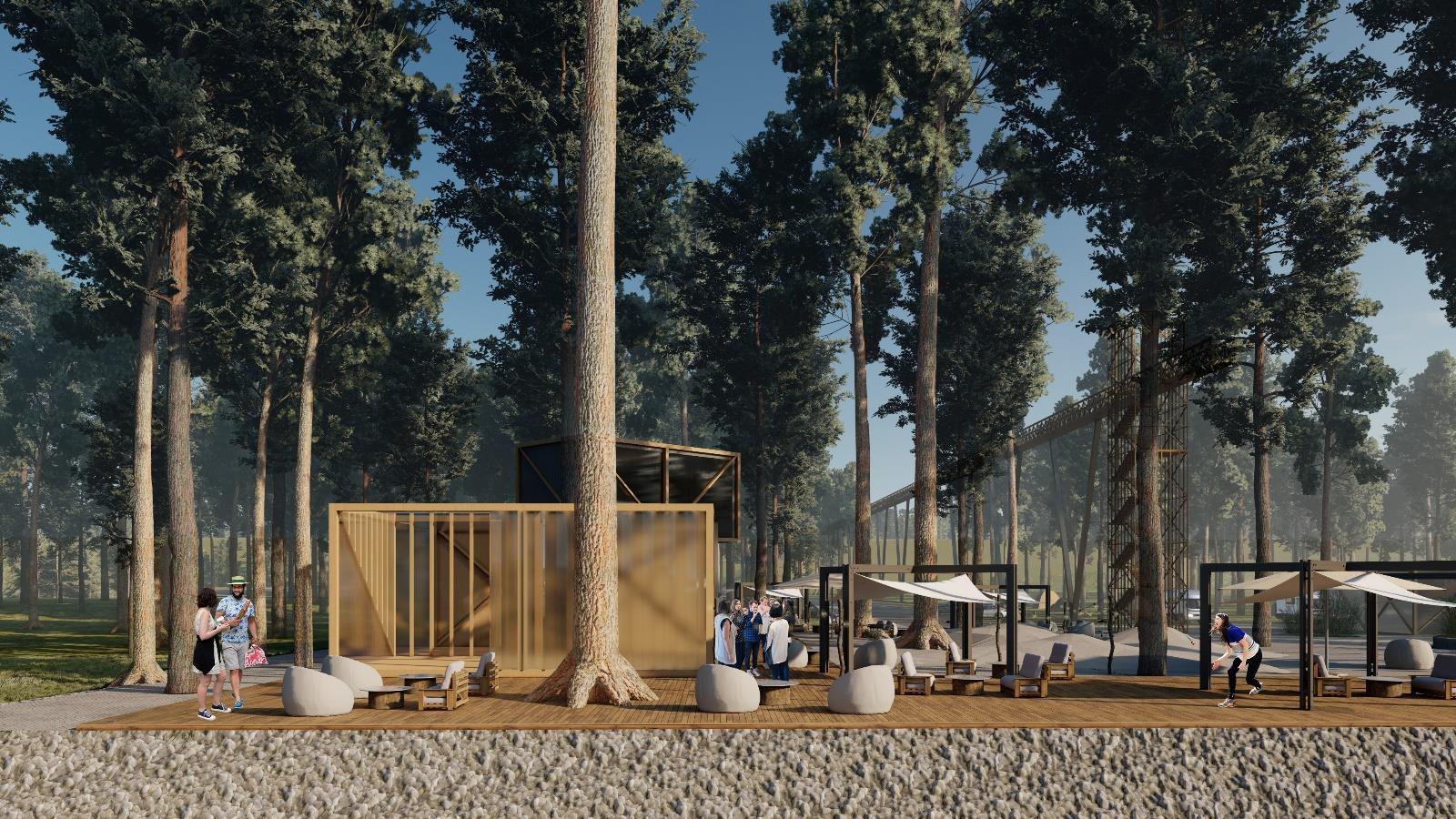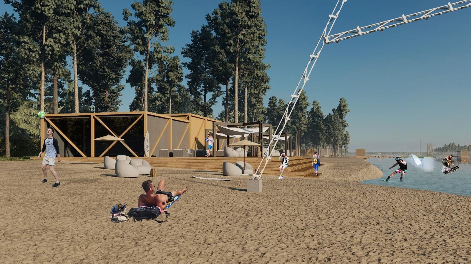 A waterboard park, a treetop adventure park, a parkour court, volleyball and beach tennis courts are being designed in the active recreation area of the southern territory. In the central square - in the "town" there is a tree top walkway tower/elevator, a building serving the campsite, cafes - rooms for renting active leisure equipment (diving equipment, paddle boards – SUP’s), a children's playground, a quieter recreation area, a multi-functional pier/sundeck. From this area, a path starts that goes through the beach - a passive recreation area (only the minimum infrastructure needed for the beach is provided here) to an educational nature trail. In the second phase, it is proposed to design a spa-type hotel with swimming pools and saunas in this area.