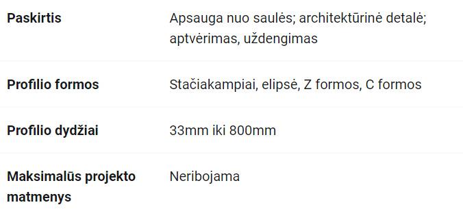 Lietuvos rinkoje viena iš pirmųjų pradėjo gaminti ir prekiauti visų rūšių žaliuzėmis, kurios montuojamos iš lauko pusės (lauko apsauga nuo saulės), apsauginėmis žaliuzėmis, fasadinėmis žaliuzėmis, horizontaliomis žaliuzėmis, stacionariomis žaliuzėmis, terasinėmis markizėms, žiemos sodų markizėmis, vertikaliosiomis markizėmis.