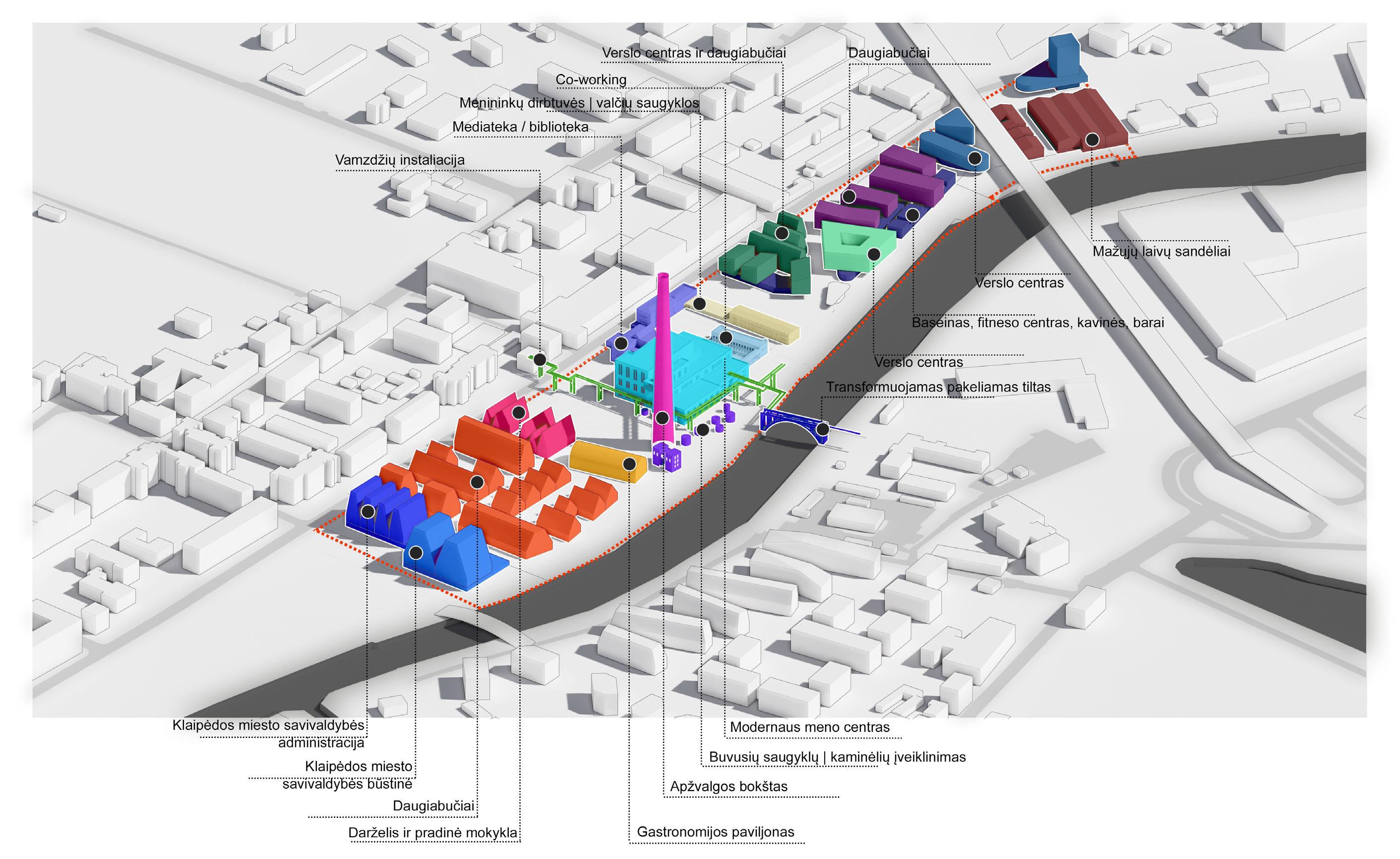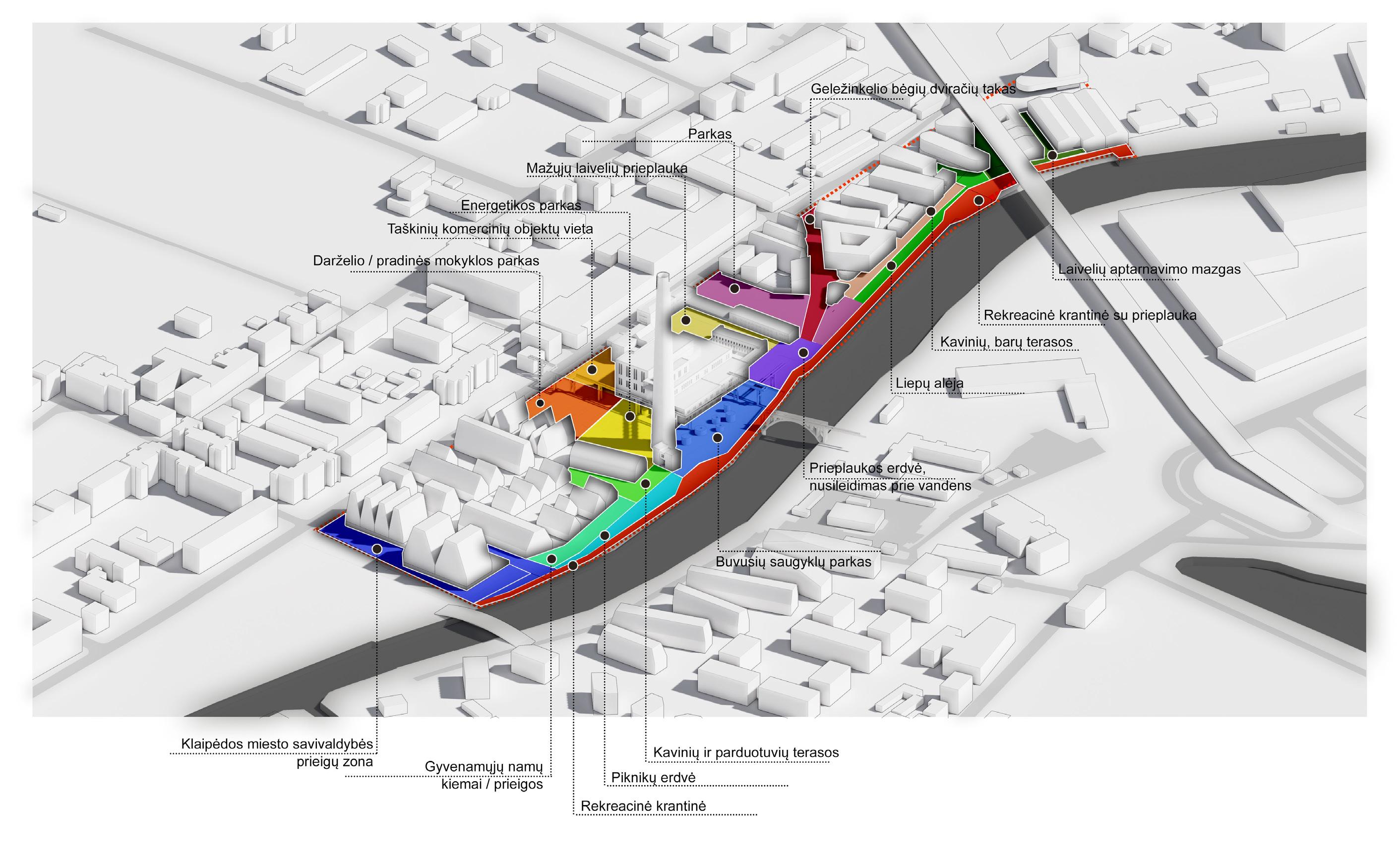 Teritorijoje siūlomos skirtingos viena kitą papildančios funkcijos. Greta Danės skvero siūloma kurti Klaipėdos miesto savivaldybės administracijos pastatus, už jų- daugiabučių kvartalus su kiemais, ir viešomis prieigomis, elektrinės kaminą pritaikyti apžvalgai, o šalia kamino erdvės dėstyti gastronomijos paviljoną, pradinę mokyklą su vaikų darželiu. Dabartinėje katilinėje siūloma kurti modernaus meno centrą, šalia jo išsaugoti vamzdžių struktūras kaip erdvinį kompozicinį meninį elementą, elektrinės administracijos pastatus pritaikyti mediatekai / bibliotekai, o bauhauzo stiliaus nuostabius pastatėlius - meininkų dirbtuvėms, valčių saugykloms, co-working centrui. Rytinėje teritorijos dalyje siūlomi kvartalai su viešomis funkcijos pirmuosiuose aukštuose ir ofisais arba daugiabučiais - viršutiniuose. Už tilto, šalia mažųjų laivų prieplaukos siūloma kurti mažųjų laivų sandėlius.