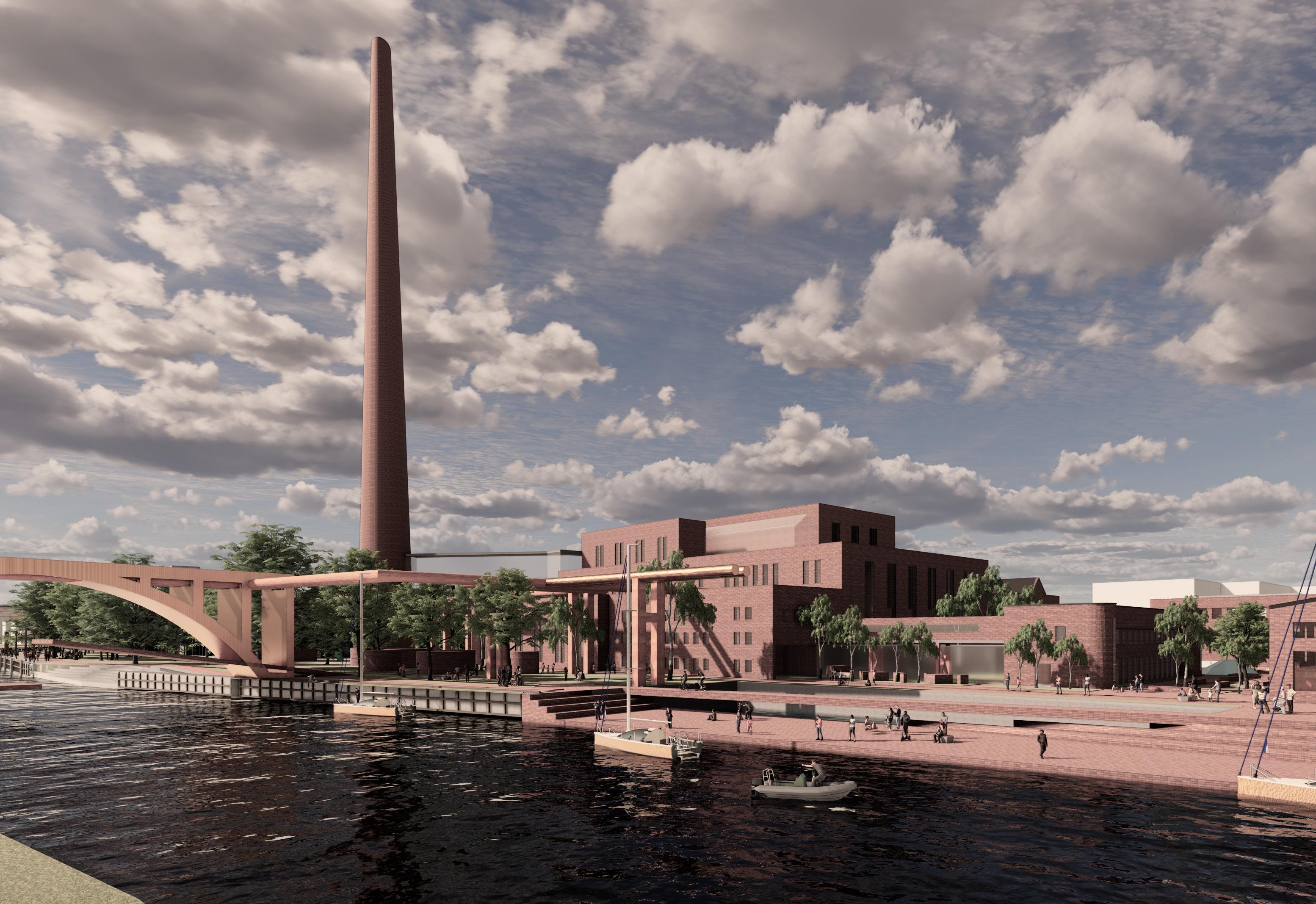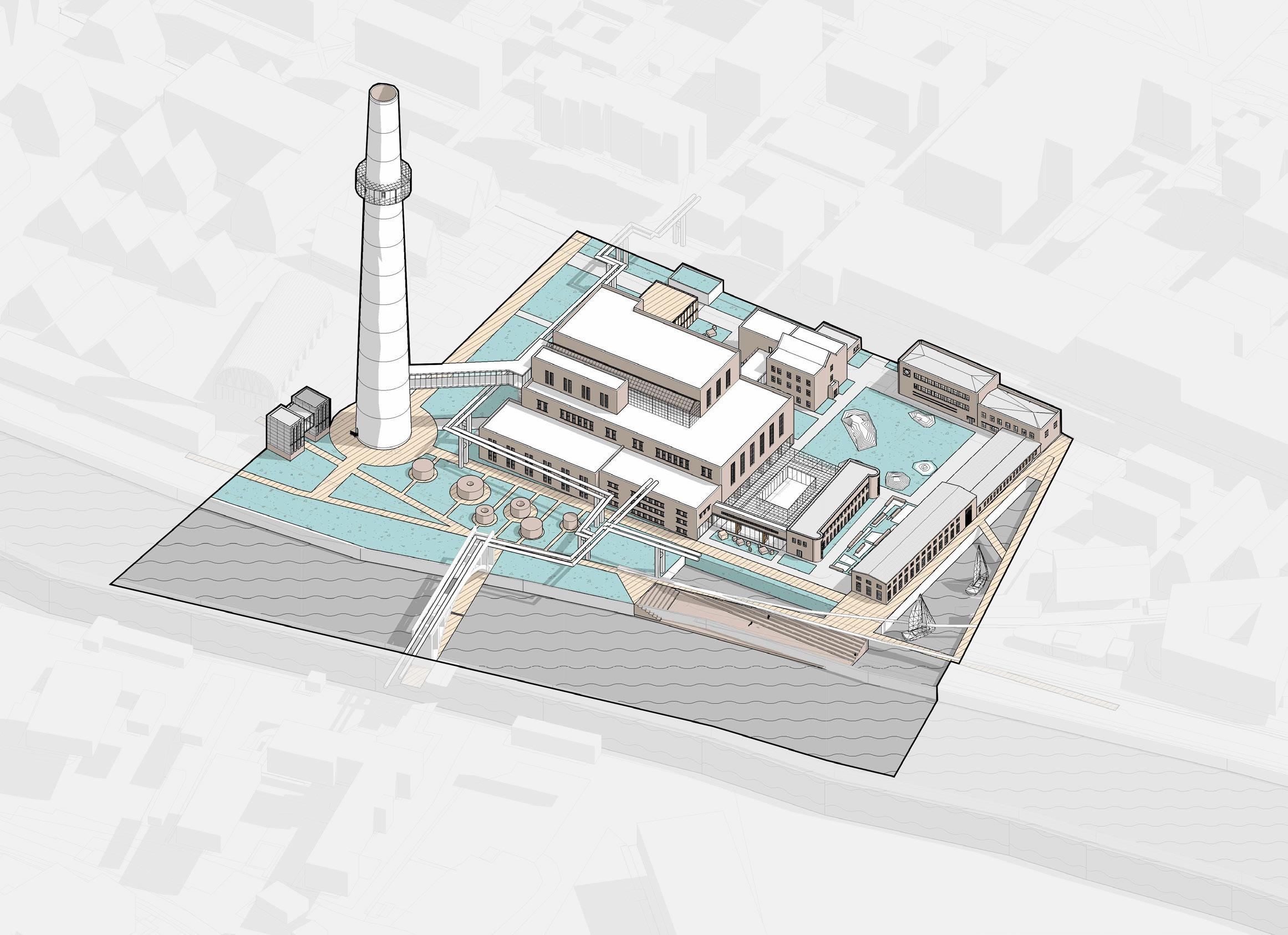 Teritorijoje ,,Klaipėdos šiluminės elektrinės pastatų kompleksas (kodas 25808)’’ planuojama įrengti modernaus meno centrą, klaipėdos technikos muziejų ir ofisus su atrijumi pagrindiniame (25811) pastate, numatoma jungtis tarp šio pastato ir kamino, kuris transformuojamas į vertikalų pažinimo centrą su apžvalgos tašku viršutinėje dalyje. Vakrinėje pastato dalyje yra nuamtomas energetikos parkas su šio parko administravimo pastatu. Paliekami teritorijoje esantys inžineriniai įrenginiai, vamzdynai. Tarp elektrinės pastato ir Klaipėdos šiluminės elektrinės pastatų komplekso skirstyklos (25812) po tarp jų esančia jungtimi numatomas maisto turgus, stiklinis tūris. Toks sprendimas priimtas siekiant aplikti matomumą tarp įėjimo teritoriją ir upės. Bauhaus stiliaus skirstykloje įrengiami laikinosios nuomos intravertiški ofisai - darbui po vieną. Pietinėje dalyje priešais pagridninio pastato fasadą projektuojami ekspoziciniai paviljonai skirti Klaipėdoje kuriančių menininkų ir čia reziduojančių svečių darbų ekspozicijai. Administracinis pastatas (25809) restauruojamas, lieka AB ,,Klaipėdos energijos’’ administracijai. Dirbtuvių pastatuose (25813) numatomos menininkų dirbtuvės (žemesnėje dalyje), kita dalis atitenka valčių saugykloms, patekimas jas numatomas atvedant vandenį link pastato šiuo metu teritorijoje išbetonuotą ir neįveiksmintą plotą. Teritorijoje numatomas pakeliamas pėsčiųjų tiltas po dabartine konstrukcija inžinerijoms. Konstrukcija išsaugoma. Numatomas amfiteatras, žaidimų aikštelės, erdvės bendruomenės susitikimams, sėdėjimo zonos, lauko biblioteka. Mediateka su biblioteka numatomi naujai projektuojamame mediniame ofise šiaurinėje dalyje greta įvažiavimo požeminį parkingą. Komplekso ūkinis pastatas (25810) tampa konferencijų erdve teritorijos pastatais besinaudojantiems asmenims.