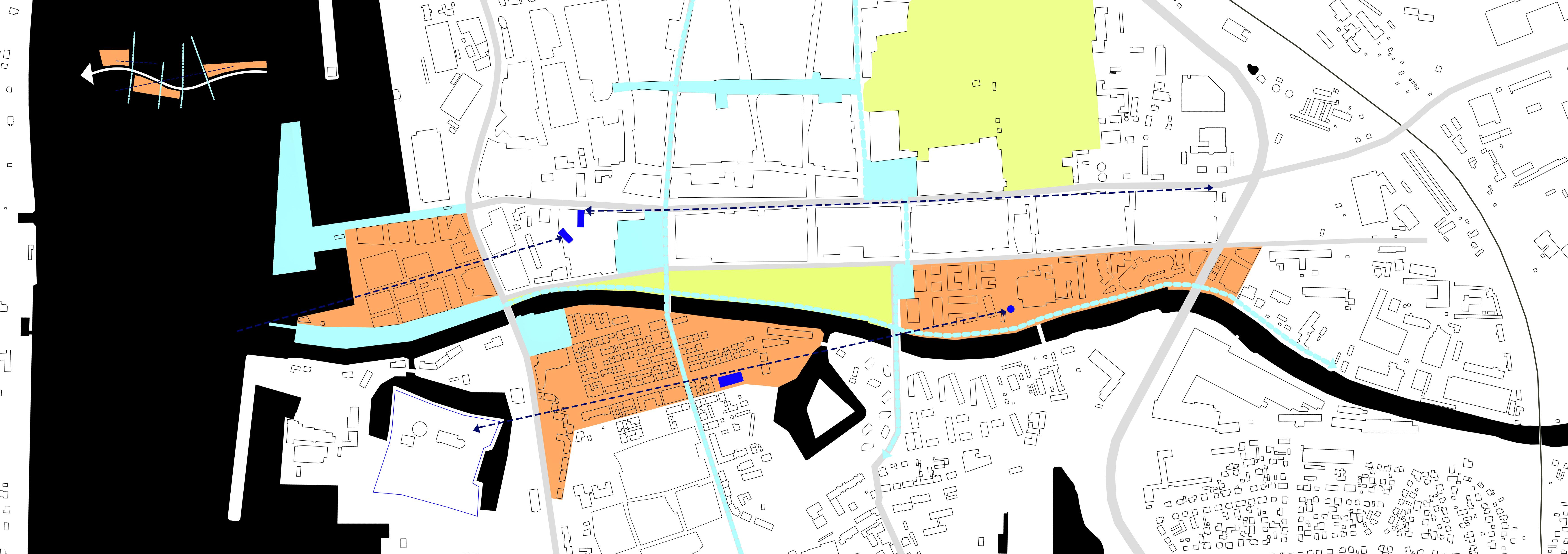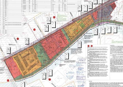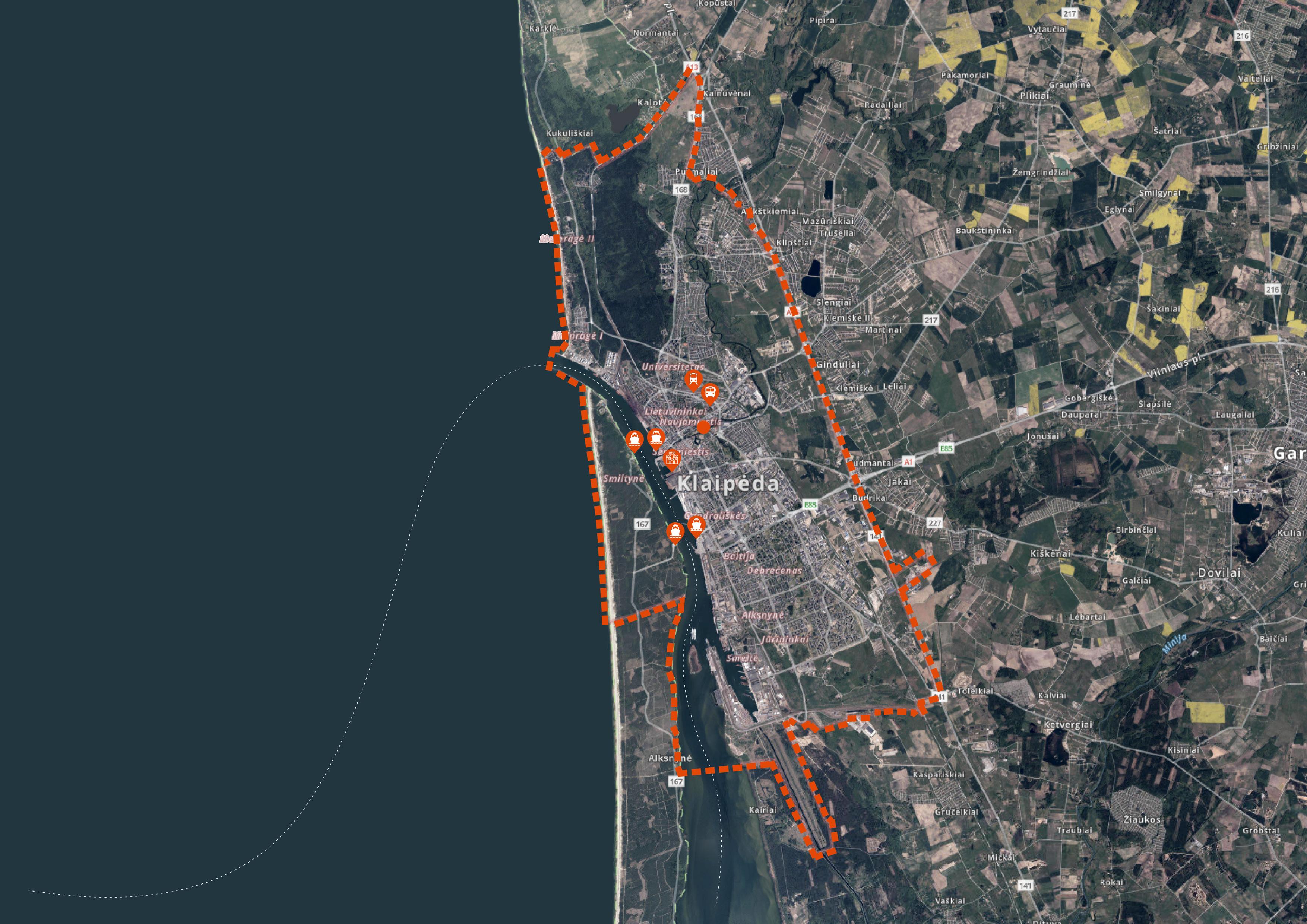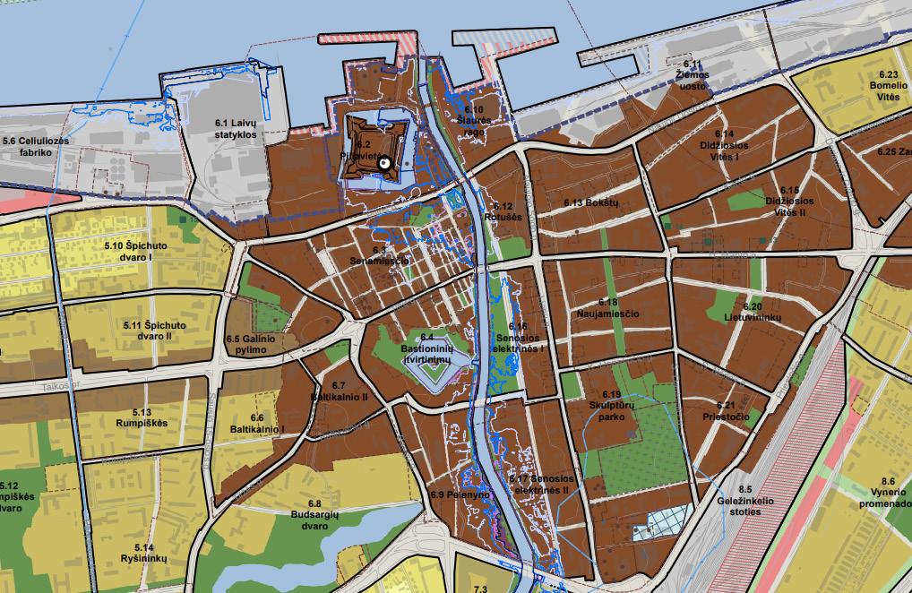 The analyzed territory is divided to three seperate plots. , in the western part, the Klaipėda City Municipality building, as well as residential apartment blocks, a kindergarten and a school are being designed. Area 2 is an area included in the cultural heritage register, dominated by public buildings, as well as administrative and commercial buildings. In the eastern part, business centers, apartment buildings, a swimming pool, a fitness center, commerce and warehouses for small ships are being designed.