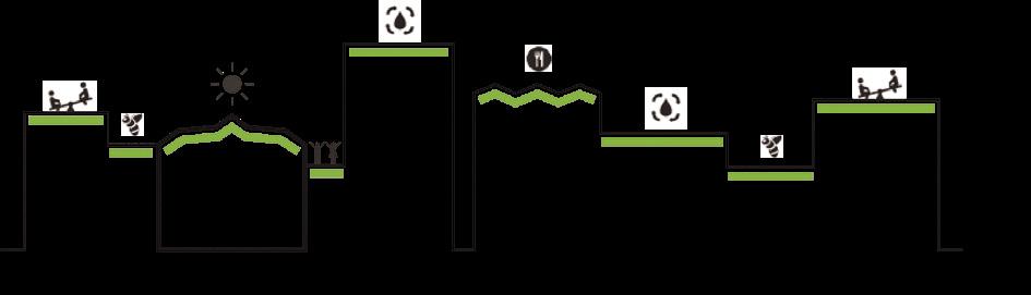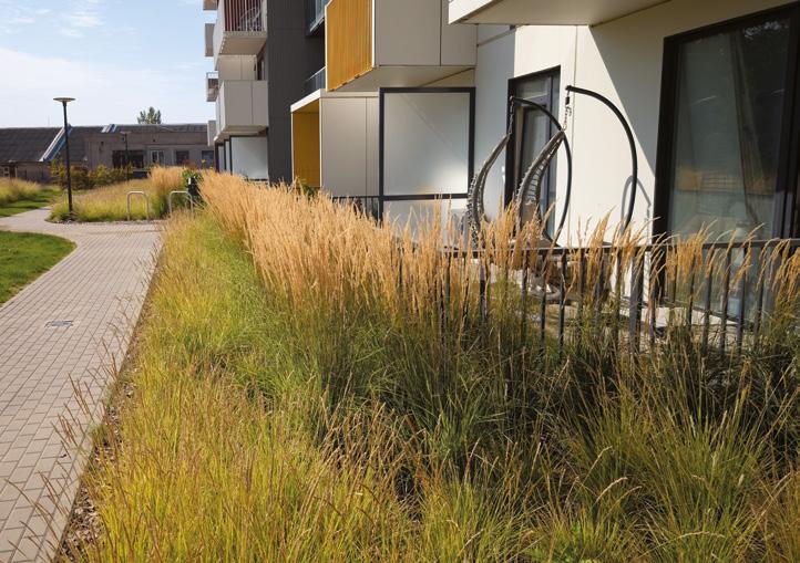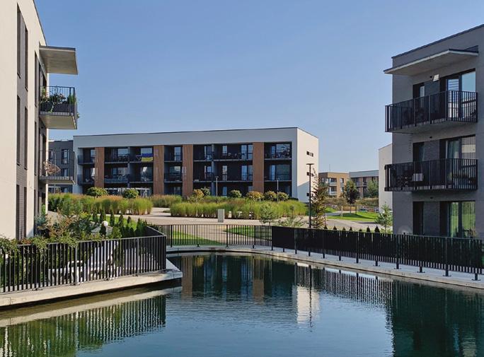 Gyvenamieji pastatai savo kontūrais apjuosia didelę vidinę žaliąją zoną, o šios vešli augmenija surenka lietaus vandenį ir sustiprina rajone bendruomeniškumo jausmą. Išskirtinumo rajonui suteikia monumentalus įėjimas į gy-