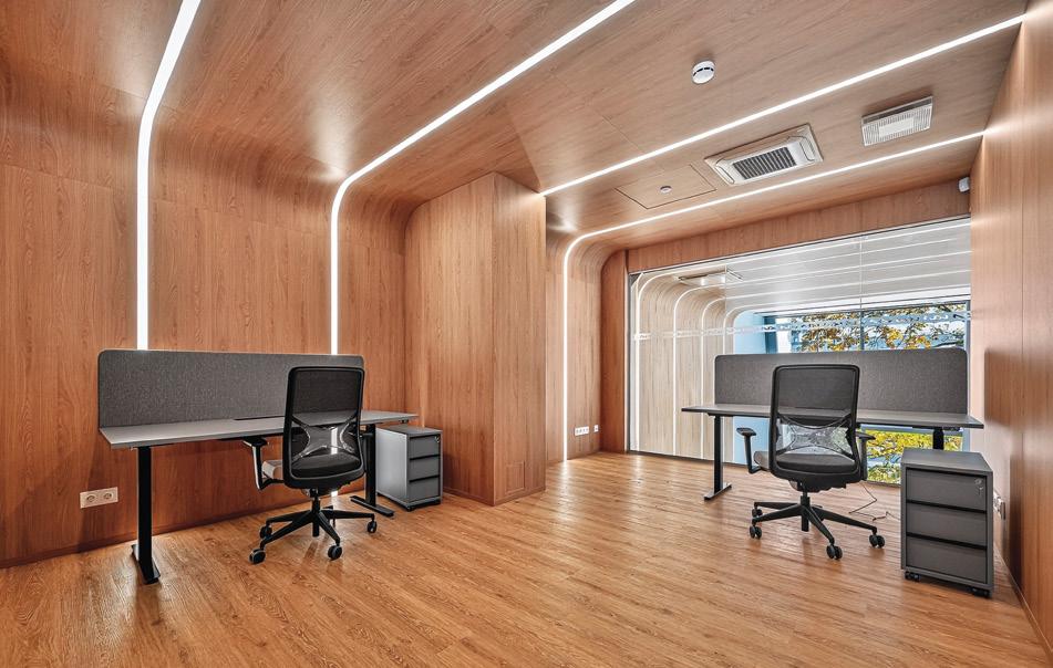 „TWIST&SIT Soft“, ąžuolo spalvos faneros konferencinės kėdės MOON. Šiais ir kitais kruopščiai apgalvotais sprendiniais buvo išlaikyta vientisa interjero dizaino linija ir kartu užtikrintas funkcionalumas prisitaikant prie nuolat kintančių centro poreikių.