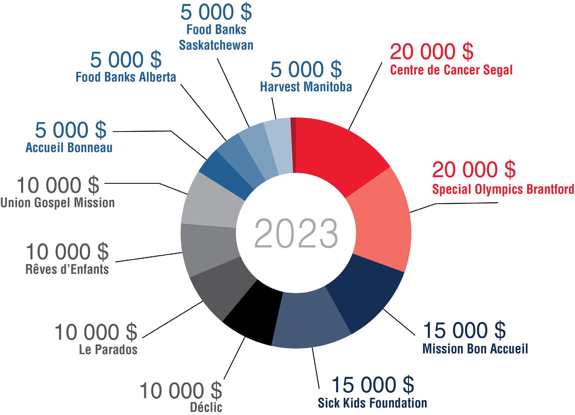 Grâce à votre générosité, nos revenus ont dépassé 400 000 $ en 2023. Votre soutien est essentiel et nous permet de continuer à travailler pour les causes qui sont importantes pour les Teamsters. Nous aimerions exprimer notre plus profonde gratitude aux golfeur·euse·s et à leurs invité·e·s qui ont participé au Tournoi de Golf au Club Le Diable de Mont-Tremblant, ainsi qu'à tou·te·s ceux/ celles qui ont acheté une paire de chaussettes en laine dans le cadre de notre campagne Le cœur et les pieds au chaud.