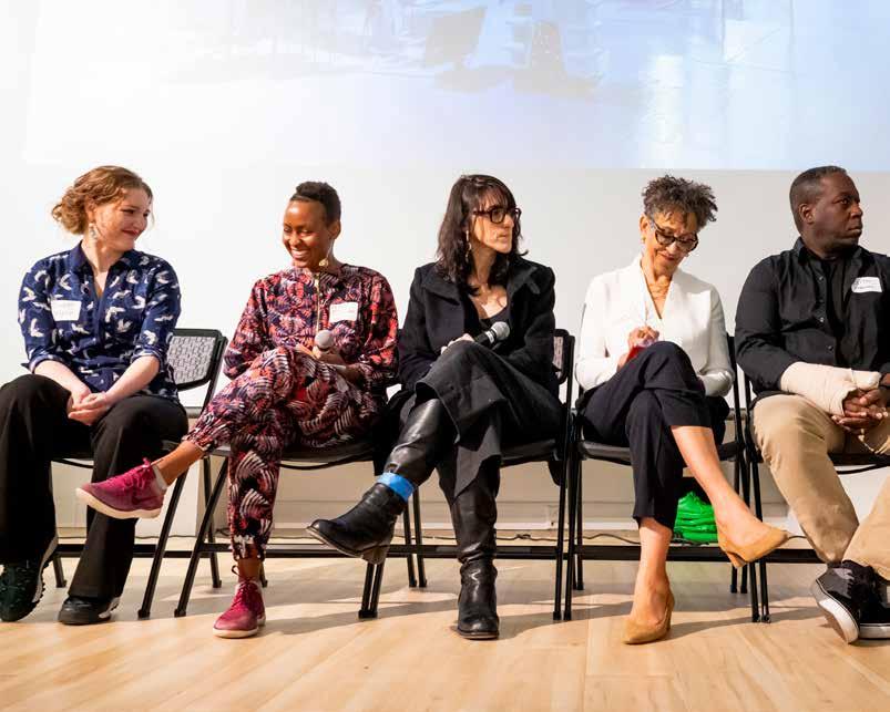 L to R: Schuyler Dragoo, MFA candidate, SMFA, Ng’endo Mukii, Professor of the Practice, Film, Video, and Animation (SMFA), Daniela Rivera, Professor of Art, Wellesley College, Dayna Cunningham, Pierre and Pamela Omidyar Dean of Tisch College of Civic Life, Keith Maddox, Professor of Psychology and Director of the Social Cognition Lab (Arts and Sciences), Patte Loper, Professor of the Practice, Painting and Drawing (SMFA).