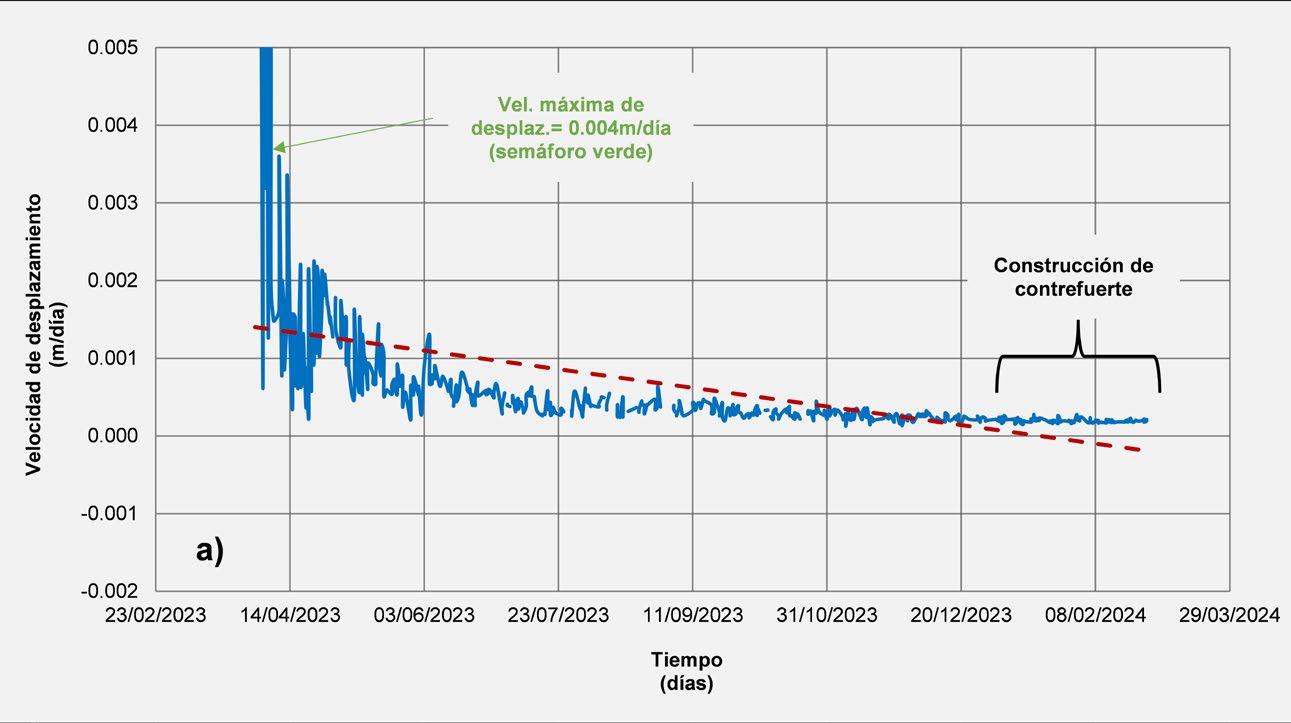 La irregularidad de los movimientos ilustrados se debe a la imposibilidad de avanzar con la excavación en capas horizontales, así como al efecto del peso de la cimbra de madera y del concreto colado, durante el periodo de observación.