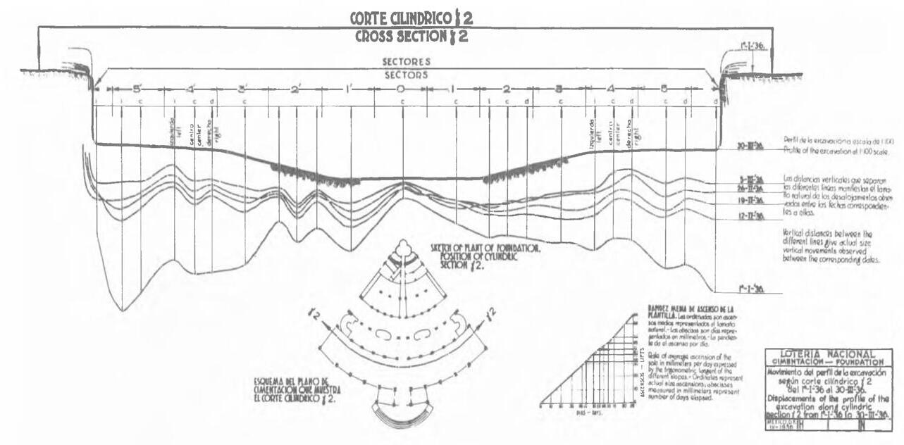 La excavación se inició el 30 de julio de 1934. Para el 25 de agosto de 1934 se habían extraído más de 10,000 m3 con una velocidad máxima de 900 m3 en 24 horas, siendo el promedio de 390 m3 por día de 24 horas. La elevación máxima observada fue de 5 centímetros en 24 horas; la mínima resultó de 0.5 cm y el promedio de 1.55 centímetros. En el anexo 17 se ilustra gráficamente la elevación de uno de los testigos entre el 30 de julio y el 31 de agosto de 1934.