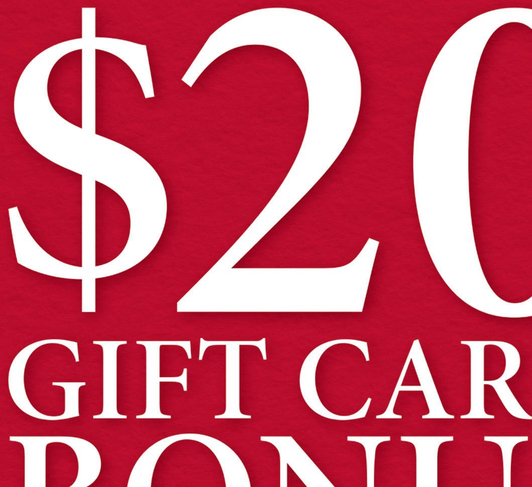 For every $100 gift card purchase, receive a $20 bonus through Dec 31.*