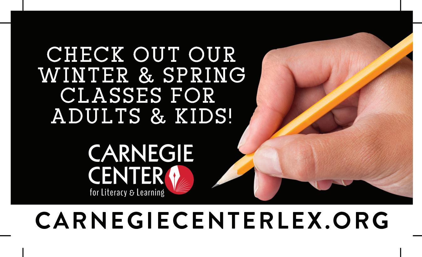 Lexington Art League Members’ Biennial. On display Dec. 6-Jan. 24. The Lexington Art League was founded in 1957 as a member-driven organization. Every two years, they highlight their creative and talented members with an exhibition. The gallery spaces throughout the historic Loudoun House will be filled with art by its members. Gallery hours: Wed.-Sat., 12-5 p.m. Lexington Art League, 209 Castlewood Dr. www.lexingtonartleague.org