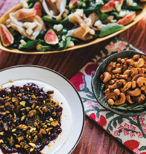 To make the dip, combine in a food processor: crumbled feta, yogurt, chili flakes, olive oil and lemon juice, blending until smooth and creamy. Taste and adjust seasoning with salt and pepper as needed. For the cranberries, if using fresh, simmer them with maple syrup or honey, orange zest and juice, and a pinch of nutmeg for 6-10 minutes, until the mixture thickens into a jam-like consistency. Once the cranberries have cooled, layer the whipped feta mixture in a shallow bowl, then top with the cranberry compote and chopped pistachios. For the finishing touch, garnish with fresh rosemary and a drizzle of honey, if desired. Serve and enjoy! ■