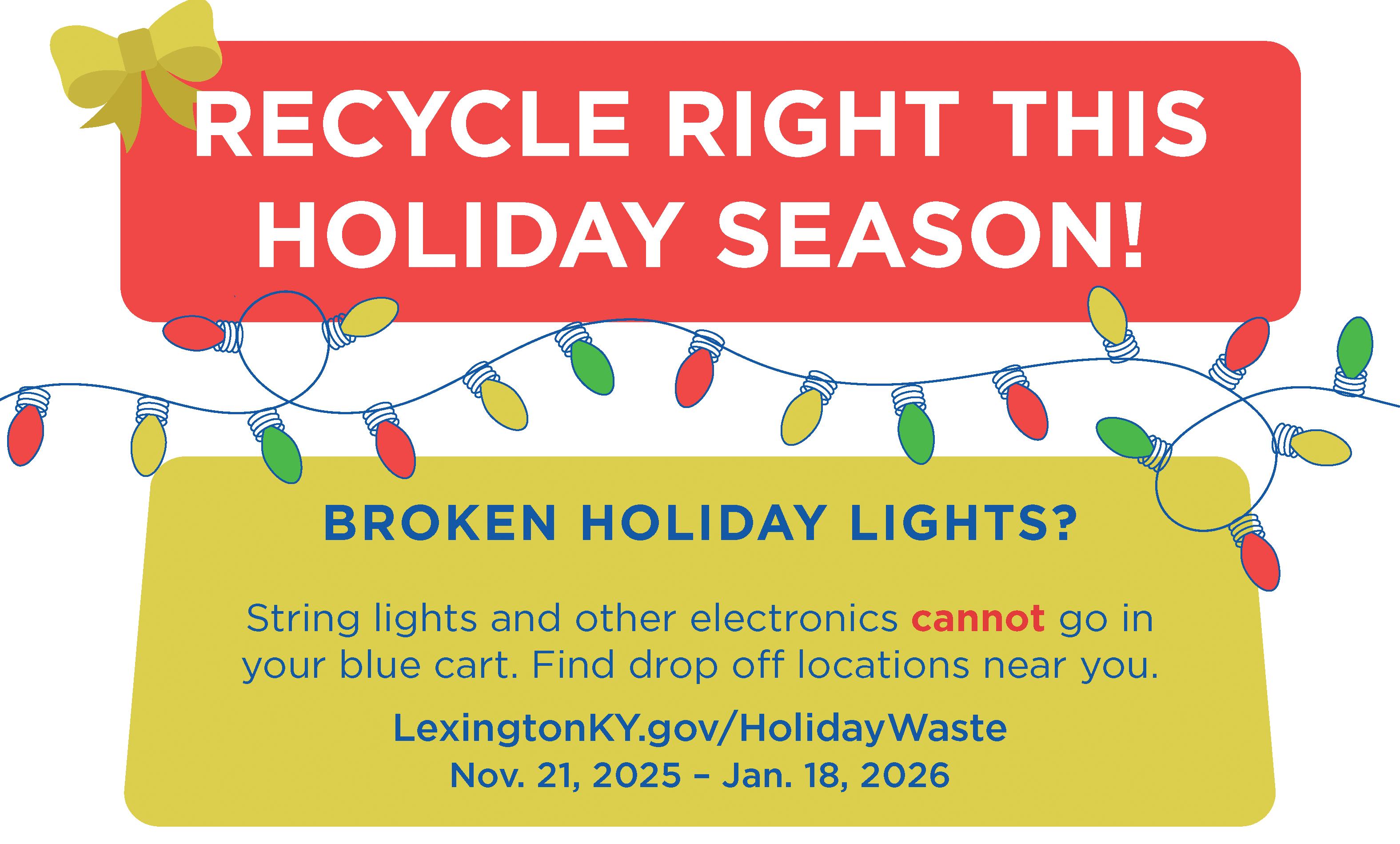 Southern Lights Holiday Festival. Daily through Dec. 31. This annual event has been helping Kentuckians get in the festive spirit for more than 20 years. Attendees can drive through more than three miles of extravagant holiday lights before heading inside to meet Santa, visit a petting zoo or take mini-train rides. Open daily 5:30-10 p.m. (closed on Christmas Day). Kentucky Horse Park, 3785 Campground Road. www.khpfoundation.org