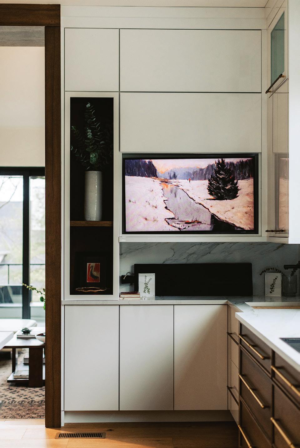 The kitchen, designed by Cucina Hand Crafted Kitchens, is at the center — and the heart — of the home. Large and modern, the cabinetry and wood accents are made from a dark walnut, which perfectly plays off the white stone countertops designed by Counter Culture.