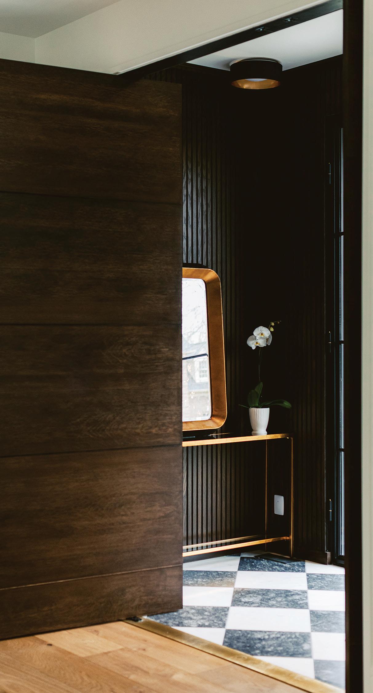Iron-andglass doors and windows are a defining feature of the Harris home. Above, two glass doors open from the front hall into the dining room.