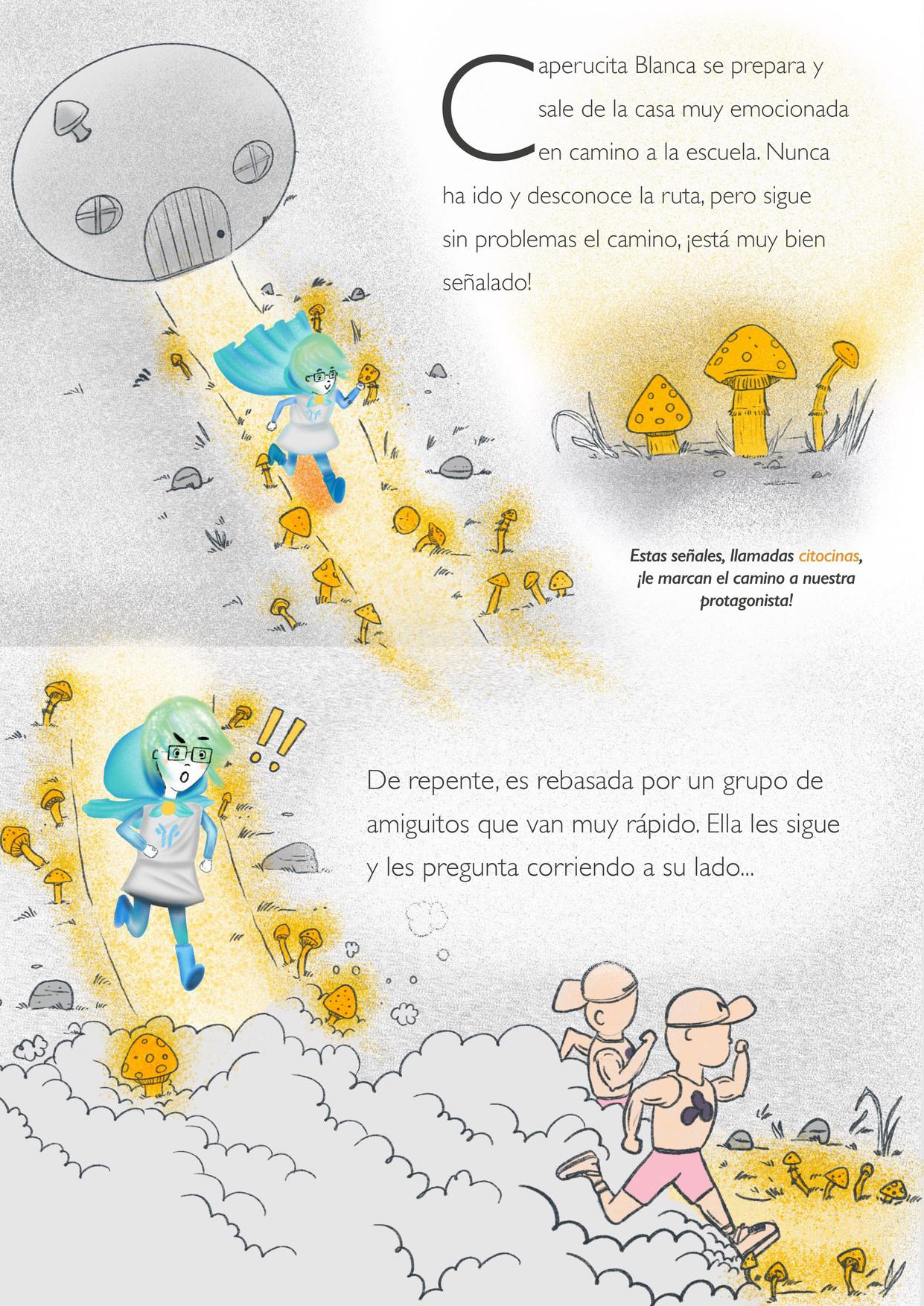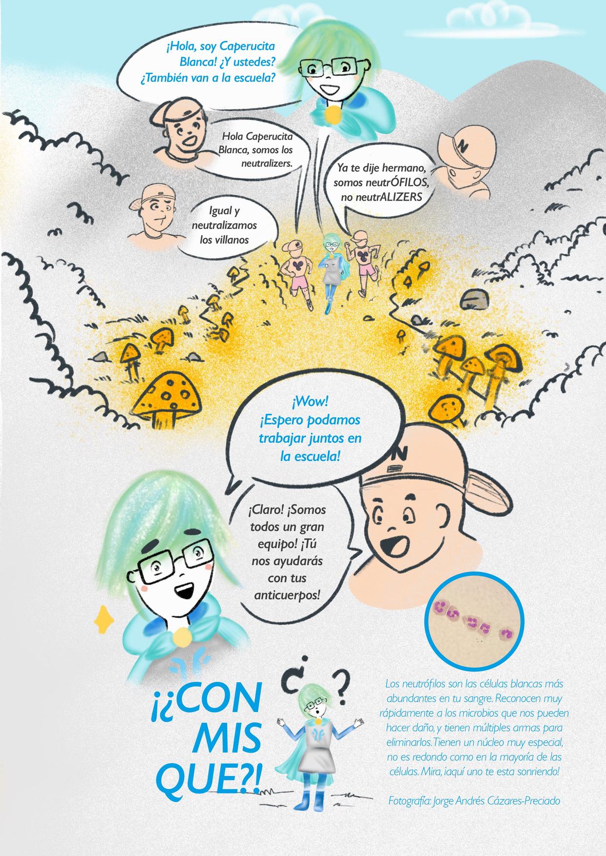 Agradecemos a Jorge Andrés Cazares-Preciado del laboratorio de la Dra. Marion E. G. Brunck por proporcionar la micrografía de los neutrófilos de sangre periférica humana para el cuento de Caperucita Blanca en este número.