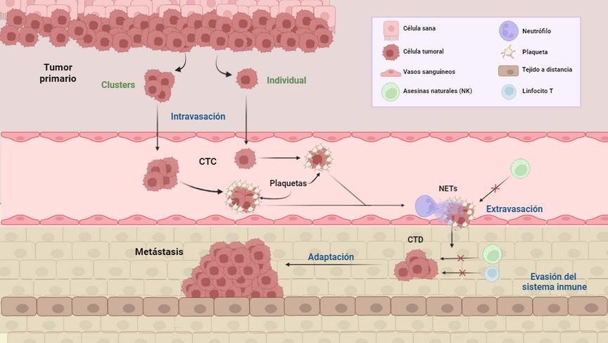Las CTC son las responsables de la diseminación tumoral. En cualquier momento de su evolución, un tumor es capaz de liberar CTC de forma individual o clusters Las CTC son liberadas por el tumor a la circulación sanguínea (intravasación) Ahí las CTC viajan recubiertas de plaquetas para escapar del reconocimiento y destrucción por parte de las células NK Además, los neutrófilos mediante la liberación de NETs promueven la salida de las CTC para colonizar un tejido a distancia. Ahí, las células tumorales se adaptan y evaden el sistema inmune para generar una lesión metastásica CTC= Células tumorales circulantes, CTD= Células tumorales diseminadas, NK= Natural killer (célula asesina natural), NET= trampas extracelulares de neutrófilos