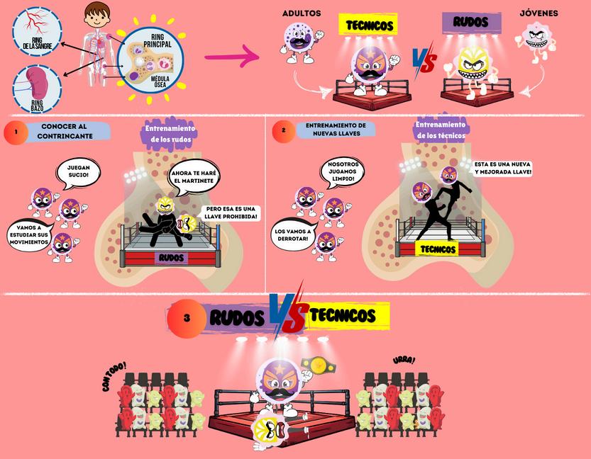 En este escenario, las células que nos defienden los técnicos se enfrentan a los blastos leucémicos los rudos Lo curioso es que estos en algún momento debutaron como técnicos, como blastos, pero decidieron ignorar las reglas y comenzaron a comportarse de manera rebelde